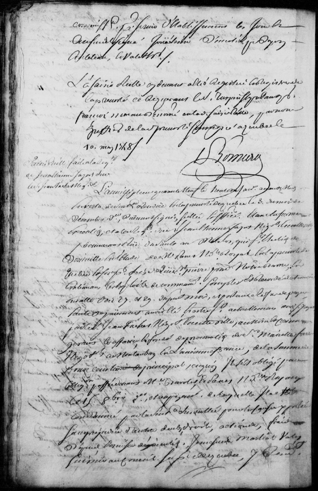 Saisie d'une maison sise en la Basse-Ville de Québec, sur une ruette au bout de la rue Notre-Dame, laquelle maison étant présentement abandonnée et sans occupant ; saisie faite suivant une sentence rendue en la Prévôté de Québec le 3 décembre 1748, à la requête de Jean-Étienne Jayat, négociant, faute du paiement par Jean Tachet (Tache), négociant de Québec, au nom et comme gérant les affaires et comme fondé de procuration des sieurs Mariette frères, négociants de Montauban en France, d'une somme de 1 200 livres ; mention d'une obligation passée devant les notaires Barolet et Panet, le 15 octobre 1748 ; mention du transport de Martial Valet, huissier au Conseil supérieur, en ladite maison ; description des lieux ; Nicolas Godin LaPoterie, bijoutier demeurant rue Saint-Jean, accepte la commission, Ignace Latour, demeurant rue de la Montagne, et Barthelémi Jouineau (Juneau), bourgeois demeurant rue Saint-Flavien, sont témoins