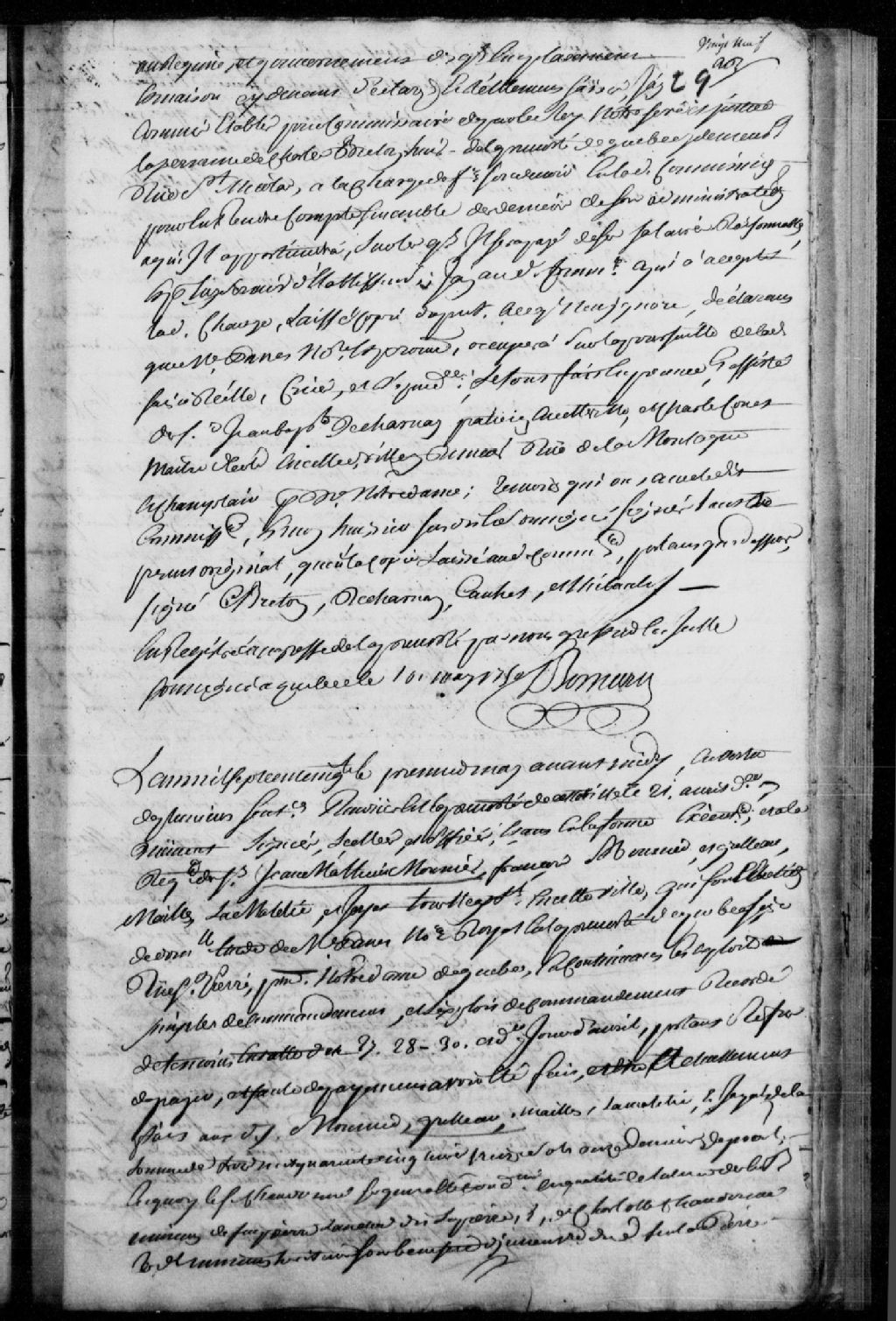 Saisie d'une maison sise rue Couillard, occupée par le nommé Coulard, suivant une sentence rendue en la Prévôté de Québec le 21 avril 1750, à la requête des sieurs Jean-Mathieu Mounier (Monnier - Monier), François Mounier (Monnier - Monier), Grelleau (Greleau), Maillet, LaMaltie (Lamaletie) et Jayat, tous négociants de Québec, faute de paiement par le sieur Chandonné, sergent des troupes, tuteur des mineurs du feu Pierre Lanclu dit LaPierre, de son vivant marchand cordonnier de Québec, et de Charlotte Chandonné ; mention du transport de François Thibault, huissier du Conseil, en ladite maison ; description des lieux et noms de voisins ; Charles Breton, huissier de la Prévôté de Québec demeurant rue Saint-Nicolas, accepte la commission, Jean-Baptiste Decharnay, praticien demeurant rue de la Montagne, et Charles Louet, maître d'école de Québec demeurant rue Champlain, sont témoins, 1er mai 1750, Archives nationales à Québec, Fonds Prévôté de Québec, (03Q,TL1,S11,SS1,D87,P26).