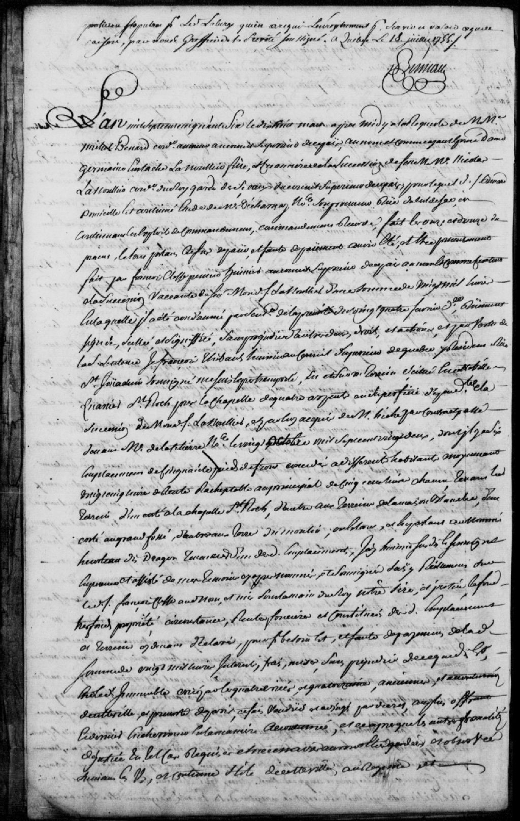 Saisie faite en vertu de la sentence rendue en la Prévôté de Québec, le 24 février 1756, à la requête de maître Michel Benard (Bénard), conseiller assesseur du Conseil supérieur de Québec, au nom et comme ayant épousé Germaine-Eustache Lanoullier, fille et créancière de la succession de feu Nicolas LaNoullier, conseiller du Roi et garde des sceaux du Conseil supérieur en Nouvelle-France, faute du paiement d'une somme de 20 000 livres par François Clesse, premier huissier au Conseil supérieur, au nom et comme curateur à la succession vacante de feu sieur LaNouiller ; mention du transport de François Thibault, huissier du Conseil demeurant rue Saint-Joachim, sur un terrain sis dans le quartier Saint-Roch, près de la chapelle, appartenant au feu sieur LaNoullier par contrat passé devant maître Lacetière, notaire, le 20 octobre 1722, ledit terrain contenant six emplacements concédés à différents habitants ; description dudit terrain et noms des voisins ; Sébastien Aubry, garde du Domaine de Sa Majesté, demeurant sur la rue du Cul-de-Sac, accepte la commission, Charles Breton, huissier demeurant rue et quartier Saint-Roch, et Robert Duhaut, huissier de la Prévôté, demeurant rue Saint-François, sont témoins