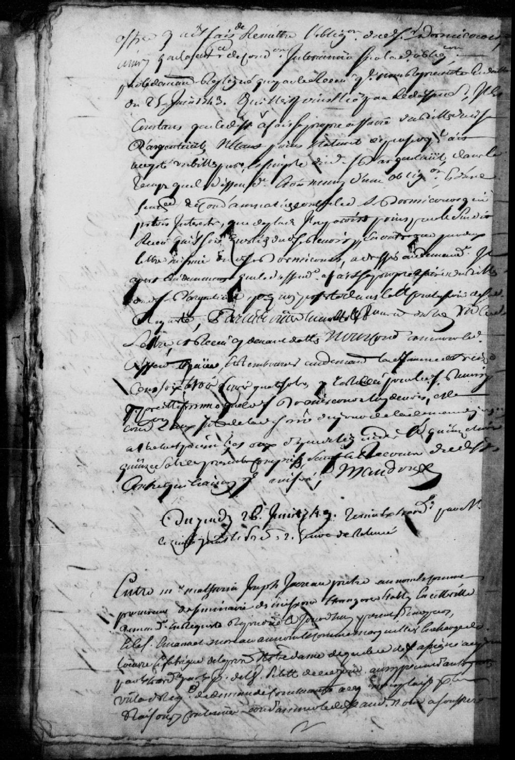 Cause entre maître Mathurin-Joseph Jacquereau, prêtre, au nom et comme procureur du Séminaire des missions étrangères établi à Québec, demandeur, et le sieur Emmanuel Moreau, au nom et comme marguillier en charge de l'œuvre et Fabrique de la paroisse Notre-Dame de Québec, défendeur, à propos de la vérification des lignes qui donnent sur le terrain de ladite Fabrique ; mention de deux procès-verbaux, l'un signé LaMorille et l'autre LeVasseur ; il est ordonné qu'il sera procédé à la vérification du plan dressé le 11 avril 1703 par le sieur Mailloux, architecte nommé par les parties, les deux procès-verbaux seront remis audit Mailloux, avec la transaction du 22 avril 1703 dont il est question