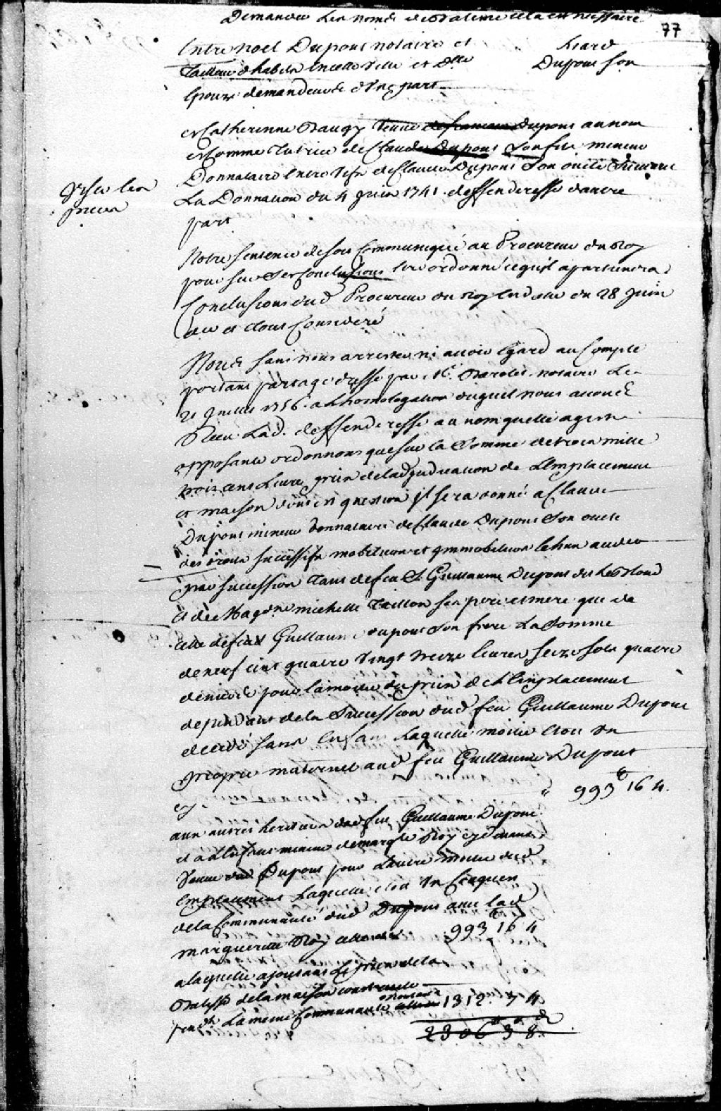 Cause entre Noël Dupont, notaire, et le nommé Liard, tailleur d'habits de Québec, et demoiselle Dupont, son épouse, demandeurs, et Catherine Baugis, veuve de feu François Dupont, au nom et comme tutrice de Claude Dupont, son fils mineur, donataire entre vifs de Claude Dupont, son oncle, suivant la donation du 4 juin 1741, défenderesse, à propos de l'adjudication d'une maison et d'un emplacement ; mention des conclusions du procureur en date du 28 juin 1757 ; mention d'un acte de partage dressé par maître Barolet, notaire, le 21 juillet 1756 ; mention de la succession des défunts Guillaume Dupont dit LeBlond et Madeleine-Michelle Taillon ; une sentence est prononcée et la demanderesse est condamnée à payer à chacun des demandeurs la somme de 230 livres, 12 sols et 4 deniers