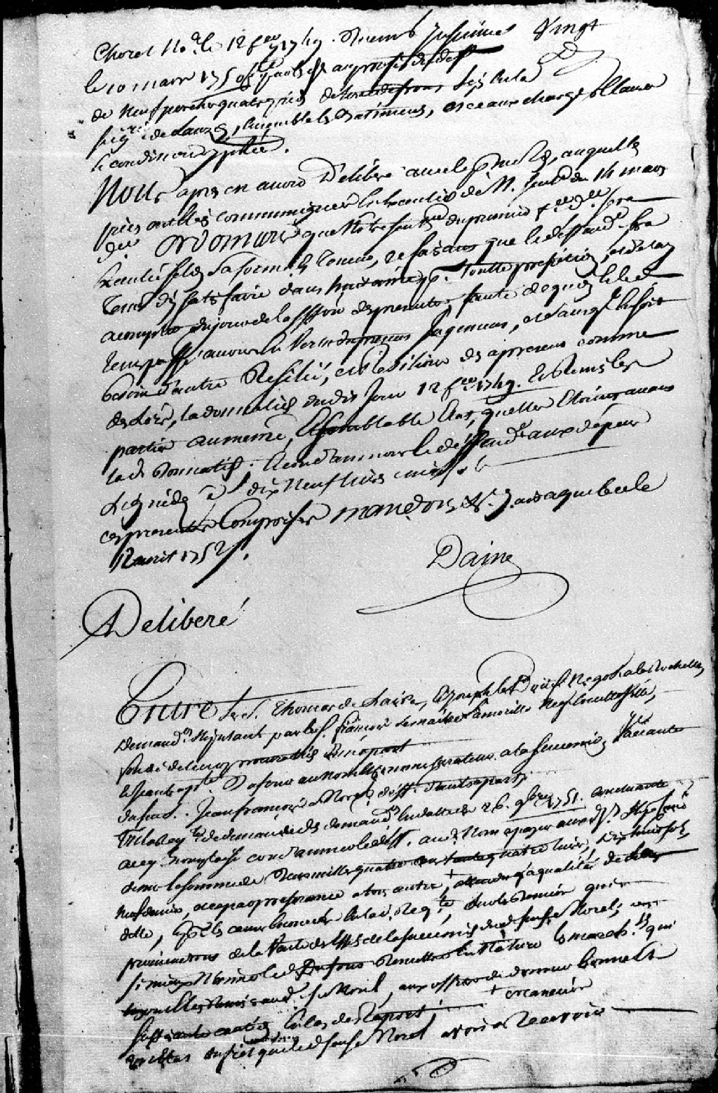 Délibéré entre le sieur Thomas de Laine (Delaine - Deleine) et Joseph LeBoeuf, négociant à La Rochelle, demandeurs, stipulant par le sieur François Lemaître Lamorille, négociant de Québec, fondé de leur procuration, et Jean-Baptiste Dufour, au nom et comme curateur à la succession vacante du feu sieur Jean-François Morel, défendeur, lequel est condamné à payer aux demandeurs la somme de 2434 livres, 18 sols et 9 deniers