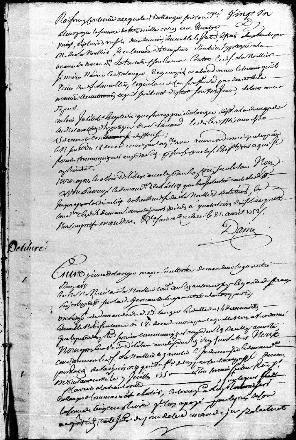Délibéré entre Pierre Bélanger, maçon de Québec, demandeur en garantie, et maître Nicolas Lanouillier (Lanoullier), conseiller du Roi au Conseil supérieur et garde-sceau, défendeur sur ladite demande de garantie ; mention d'un contrat passé devant maître Dulaurent, notaire, en date du 7 juillet 1750, concernant un terrain sis rue Saint-Flavien en la Haute Ville de Québec sur lequel ledit Bélanger a commencé à bâtir ; il est ordonné de procéder à la nomination d'experts dont les parties conviendront, ledit défendeur est condamné aux dépens liquidés à 5 livres et 15 sols, 21 avril 1752, Archives nationales à Québec, Fonds Prévôté de Québec, (03Q,TL1,S11,SS1,D97,P30).