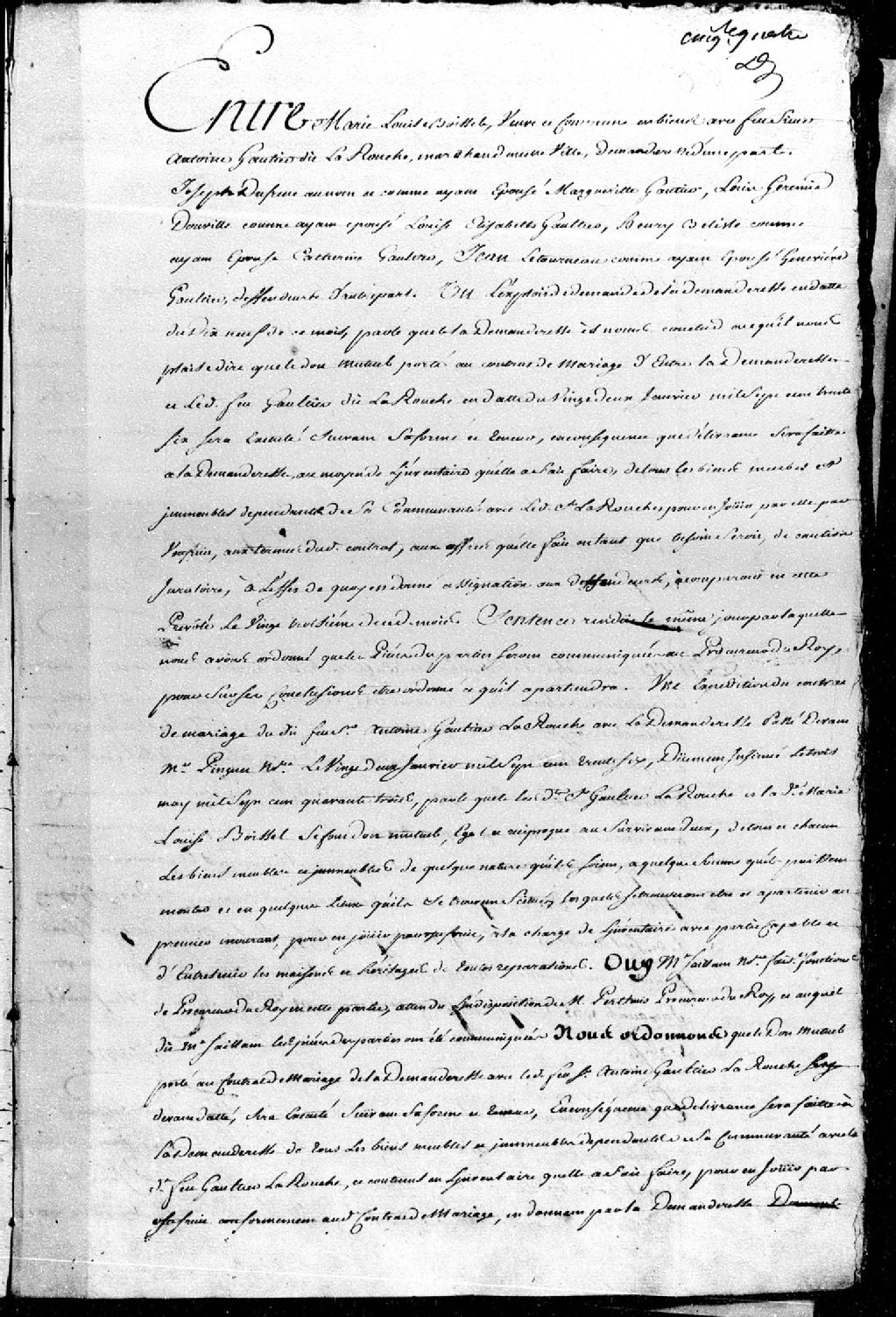 Cause entre Marie-Louise Boisselle, veuve en communauté de biens avec le feu sieur Antoine Gauthier (Gautier) dit LaRouche, de son vivant marchand de Québec, demanderesse, et Joseph Dufresne, au nom et comme ayant épousé Marguerite Gauthier (Gautier), Louis-Jérémie Douville, comme ayant épousé Louise-Élizabeth Gauthier (Gautier), Henri Belisle, comme ayant épousé Catherine Gauthier (Gautier), et Jean Létourneau, comme ayant épousé Geneviève Gauthier (Gautier), tous défendeurs, à propos de l'exécution du don mutuel mentionné au contrat de mariage entre la demanderesse et son défunt mari, passé devant maître Pinguet, notaire, en date du 22 janvier 1736 (insinué le 3 mai 1743) ; il est ordonné que ledit don mutuel sera exécuté tel que stipulé audit contrat, et les défendeur sont condamnés à délivrer tous les biens meubles et immeubles appartenant à ladite communauté de biens