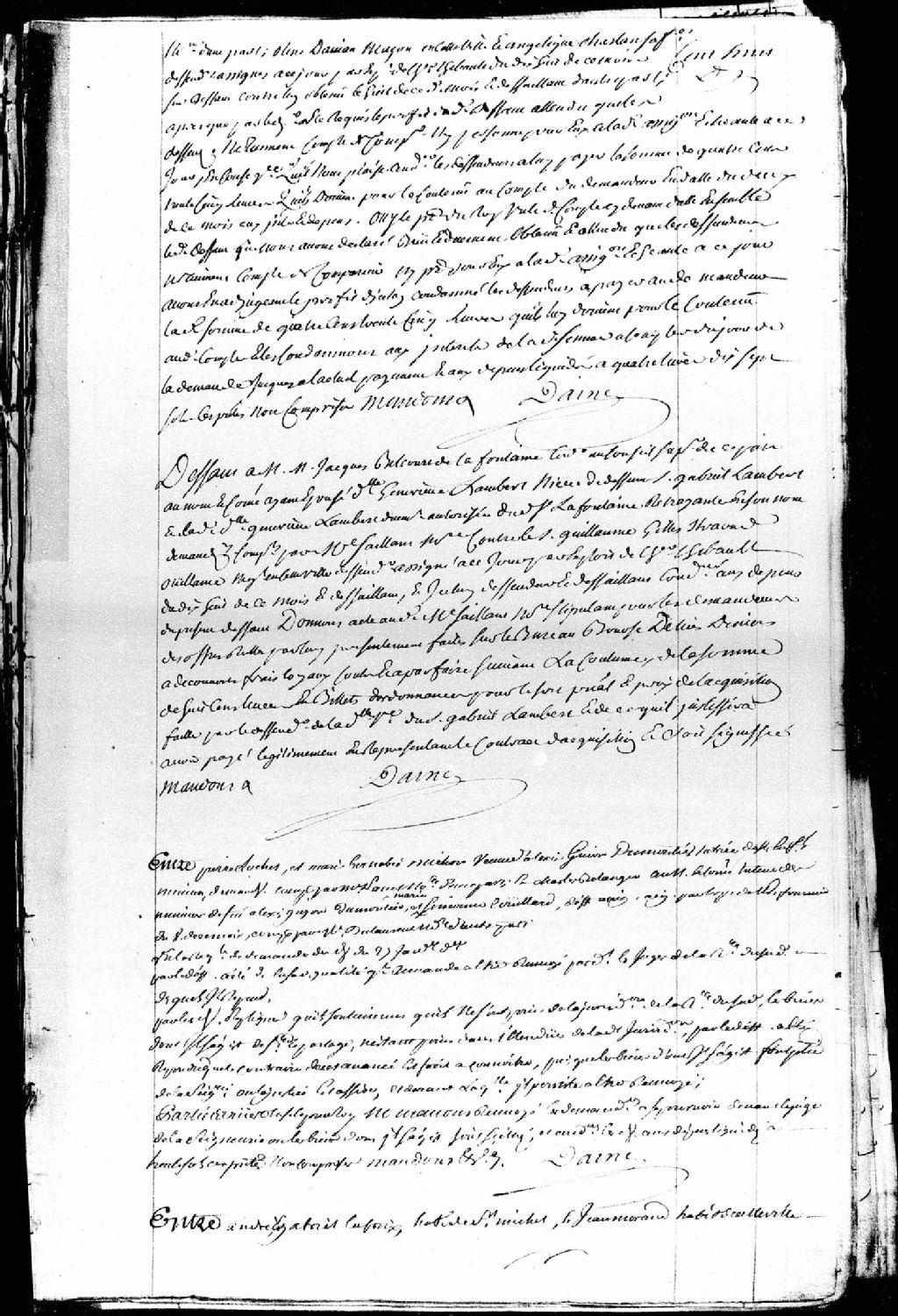 Défaut au sieur Jacques Bellecourt de Lafontaine (Delafontaine), conseiller au Conseil supérieur en Nouvelle-France, époux de Geneviève Lambert, nièce du feu sieur Gabriel Lambert, demandeur, comparant par maître Saillant, notaire; et le sieur Guillaume Gilles Straoud Ouilliame (Williame - Williams), négociant de Québec, défendeur et défaillant, ledit défaillant est condamné aux dépens, les demandeurs faisant offre de 800 livres en billets d'ordonnance pour le prix de l'acquisition fait par le défendeur de la veuve du feu sieur Gabriel Lambert