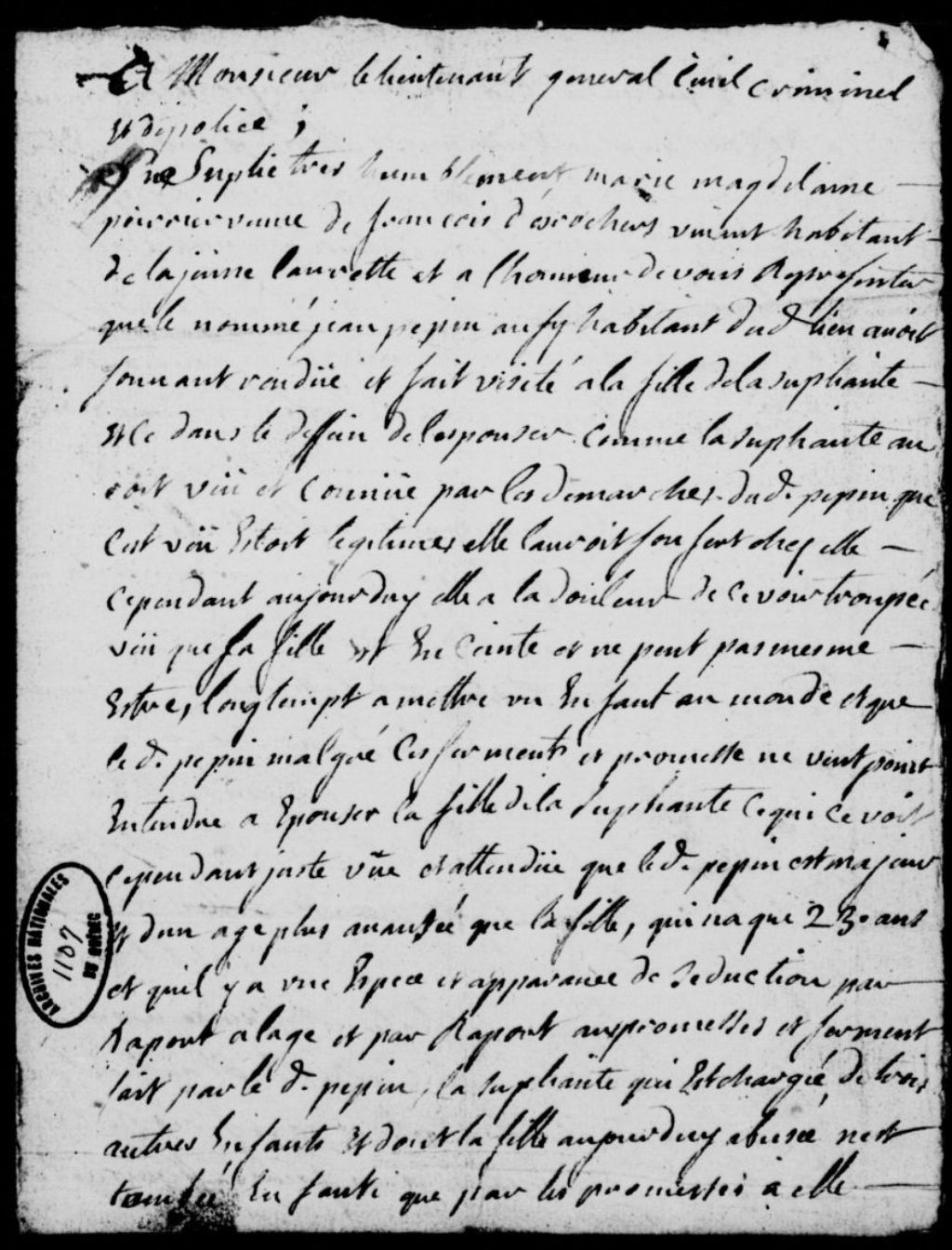 Requête de Marie-Madeleine Poirier, veuve de François Desrochers, de son vivant habitant de la Jeune-Lorette, contre Jean Pepin, habitant du même lieu, pour le faire assigner afin qu'il paie tous les frais, dommages et amende, pour la fille de la requérante qu'il a engrossée pour le bon motif (mariage), et auquel il se refuse, permis de faire assigner accordé par Pierre André de Leigne, et exploit de signification de la requête et d'assignation à Jean Pepin, 1er décembre 1735, Archives nationales à Québec, Fonds Prévôté de Québec, (03Q,TL1,S11,SS2,D1107).