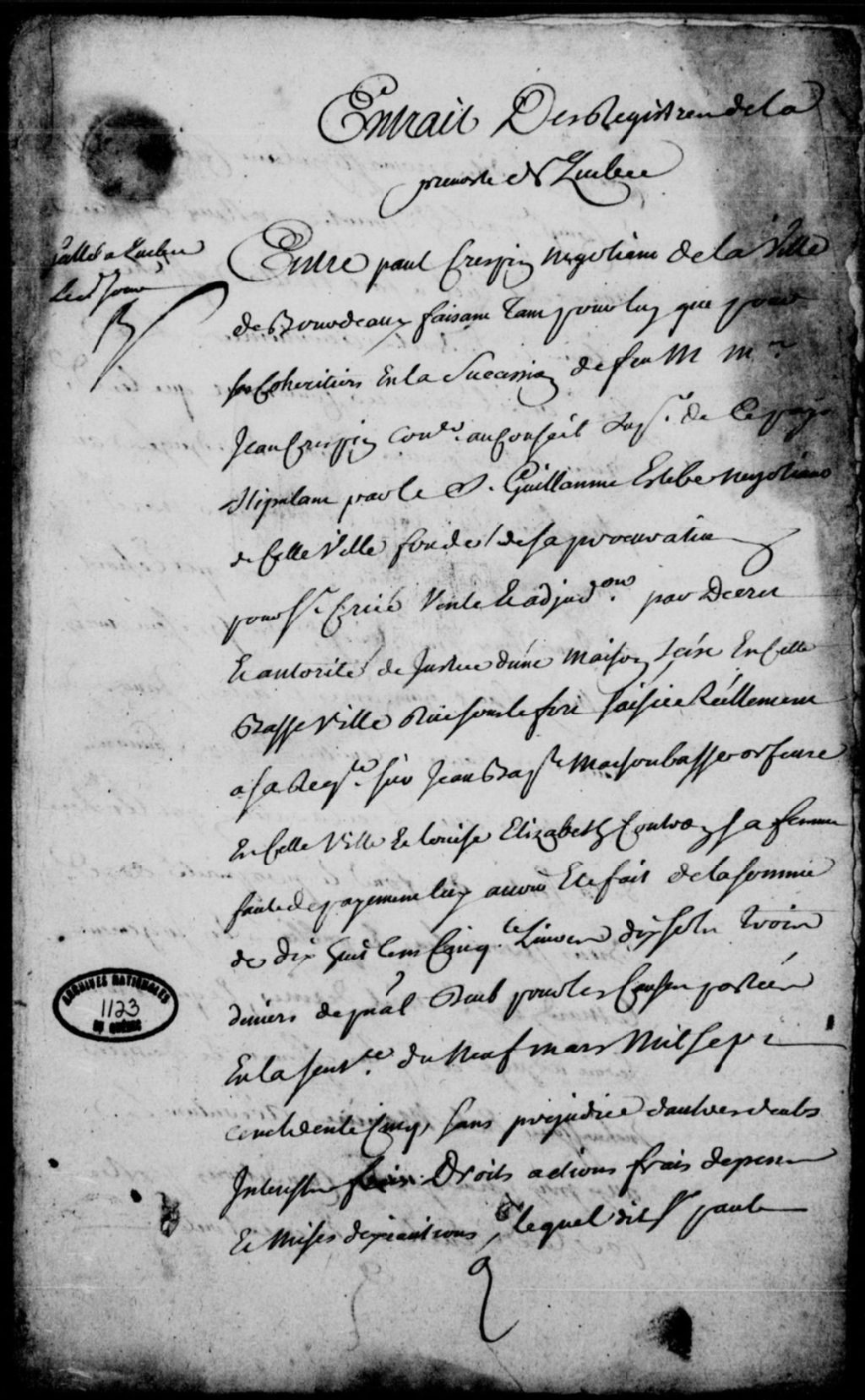 Sentences de Pierre André de Leigne, lieutenant général de la Prévôté de Québec, dans le procès de Paul Crespin (Crépin), négociant à Bordeaux et cohéritier de la succession de feu Jean Crespin, de son vivant conseiller au Conseil supérieur de Québec, stipulant par Guillaume Estèbe, contre Jean-Baptiste Maisonbasse (Detchevery), orfèvre de Québec, et Louise-Élisabeth Couteron (Coutron), sa femme, pour une dette non payée de 1850 livres, le tribunal ordonnant que les biens saisis, notamment une maison sise en la Basse-Ville de Québec, soient criés pour la dernière fois, accordant une remise à dans quinzaine de l'adjudication, et octroyant au sieur Jean de Rouvray (DeRouvray) que son droit sur ladite maison soit mentionné dans les affiches, 23 mai 1736 - 30 juin 1736, Archives nationales à Québec, Fonds Prévôté de Québec, (03Q,TL1,S11,SS2,D1123).