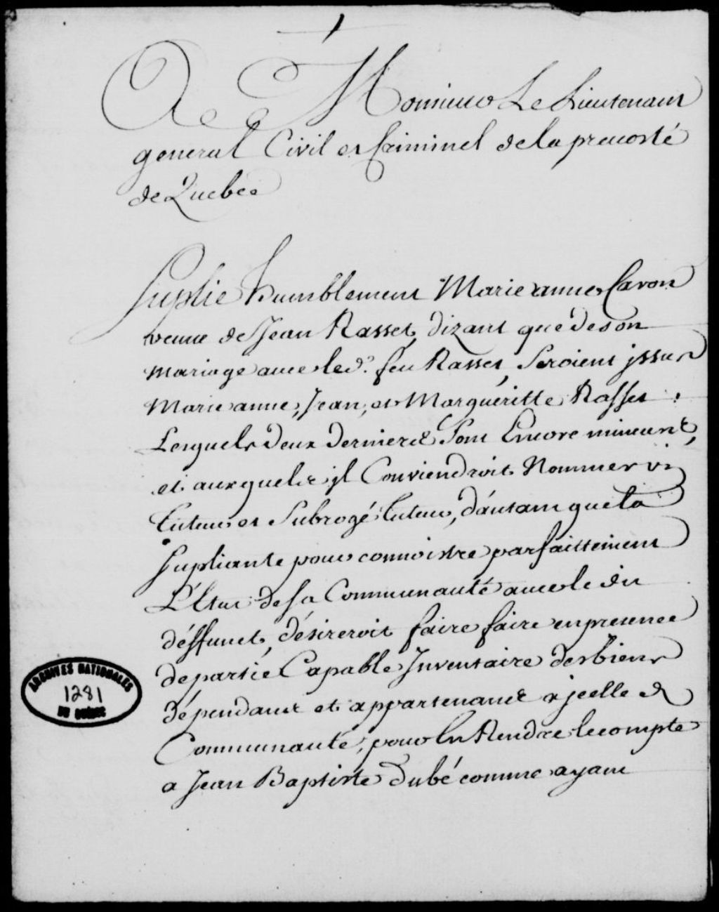 Requête de Marie-Anne Caron, veuve de feu Jean Rasset (Racet), pour obtenir l'élection d'un tuteur et d'un subrogé tuteur pour deux de ses trois enfants encore mineurs, en vue de faire l'inventaire de sa communauté de biens pour en rendre compte à Jean-Baptiste Dubé, époux de Marie-Anne Rasset (Racet), l'une des héritières, suivie d'une ordonnance pour la tenue d'une assemblée de parents et amis pour procéder à ladite élection, 27 août 1742, Archives nationales à Québec, Fonds Prévôté de Québec, (03Q,TL1,S11,SS2,D1281).