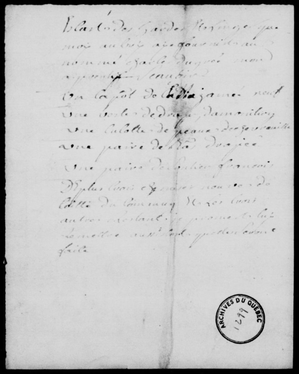 - Ce dossier comprend l'acte d'engagement pour quatre ans comme apprenti sellier de Charles Dugré (Delugré), fils mineur de Madeleine Duret, veuve de Charles Dugré, sous la direction de Louis Aubry, sellier demeurant à Québec, passé devant le notaire Boucault; un exploit de signification de l'acte à Aubry et une assignation, afin qu'il remette à Charles Dugré ses vieilles hardes retenues injustement, et lui donne un habit neuf et six chemises comme promis; un mémoire des hardes et linges qu'Aubry a fournis à Charles Dugré; une procuration d'Aubry à sa femme