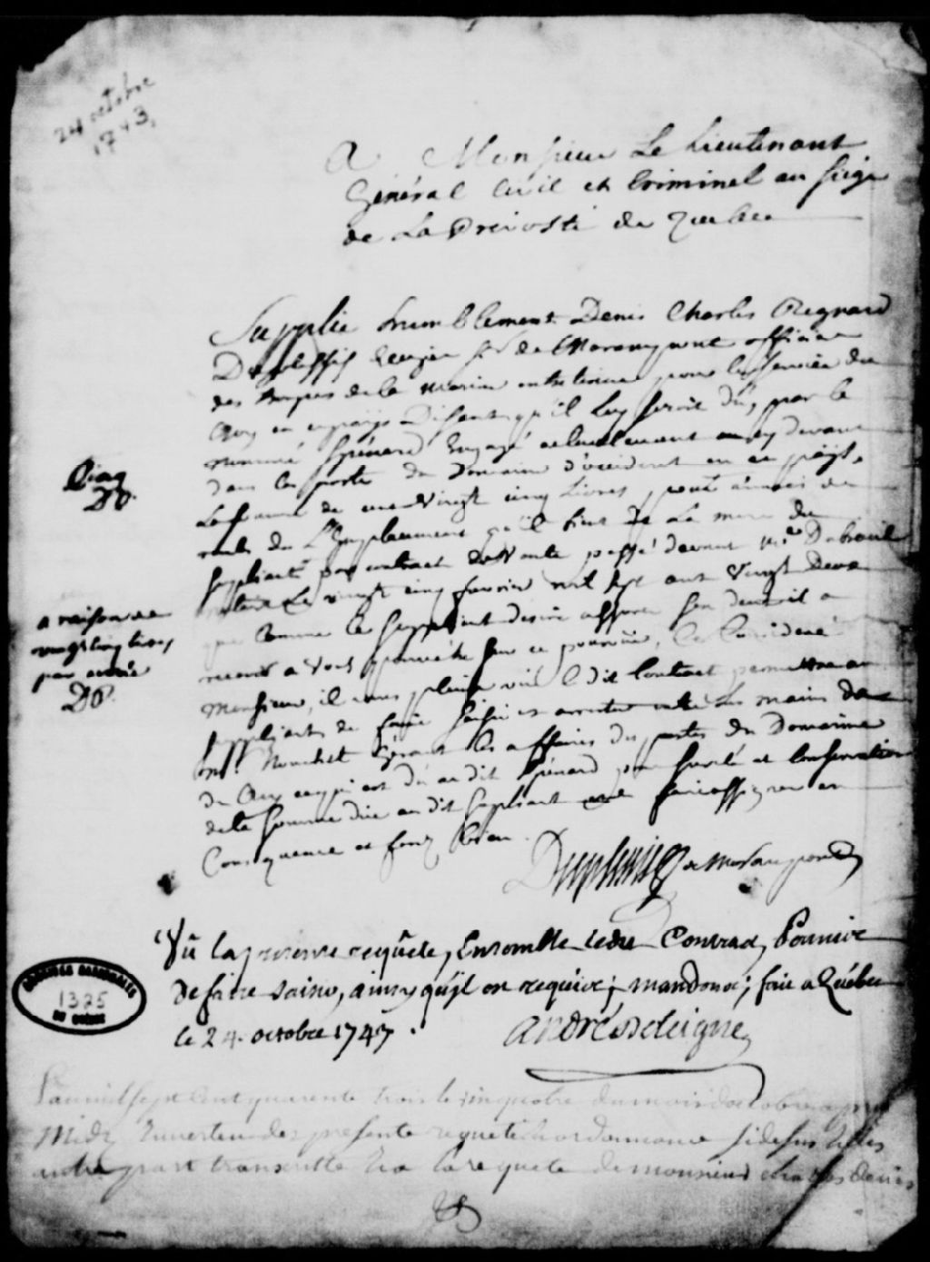 Requête de Charles-Denis Régnard Duplessis, écuyer et sieur de Morampont, officier des troupes de la marine, contre le nommé Spénard, engagé dans les postes du Domaine d'Occident, afin qu'il soit condamné à lui payer la somme de 125 livres pour un emplacement acheté le 25 février 1722 de la mère du requérant, sinon il fera saisir aux mains du sieur Nouchet, gérant des affaires des postes du Domaine, ordonnance pour faire saisir, procès-verbal de saisie et arrêt sur le nommé Spénard, exploit de signification des requête, ordonnance, saisie et arrêt audit Spénard, et assignation à lui donnée de comparaître, 24 octobre 1743, Archives nationales à Québec, Fonds Prévôté de Québec, (03Q,TL1,S11,SS2,D1325).