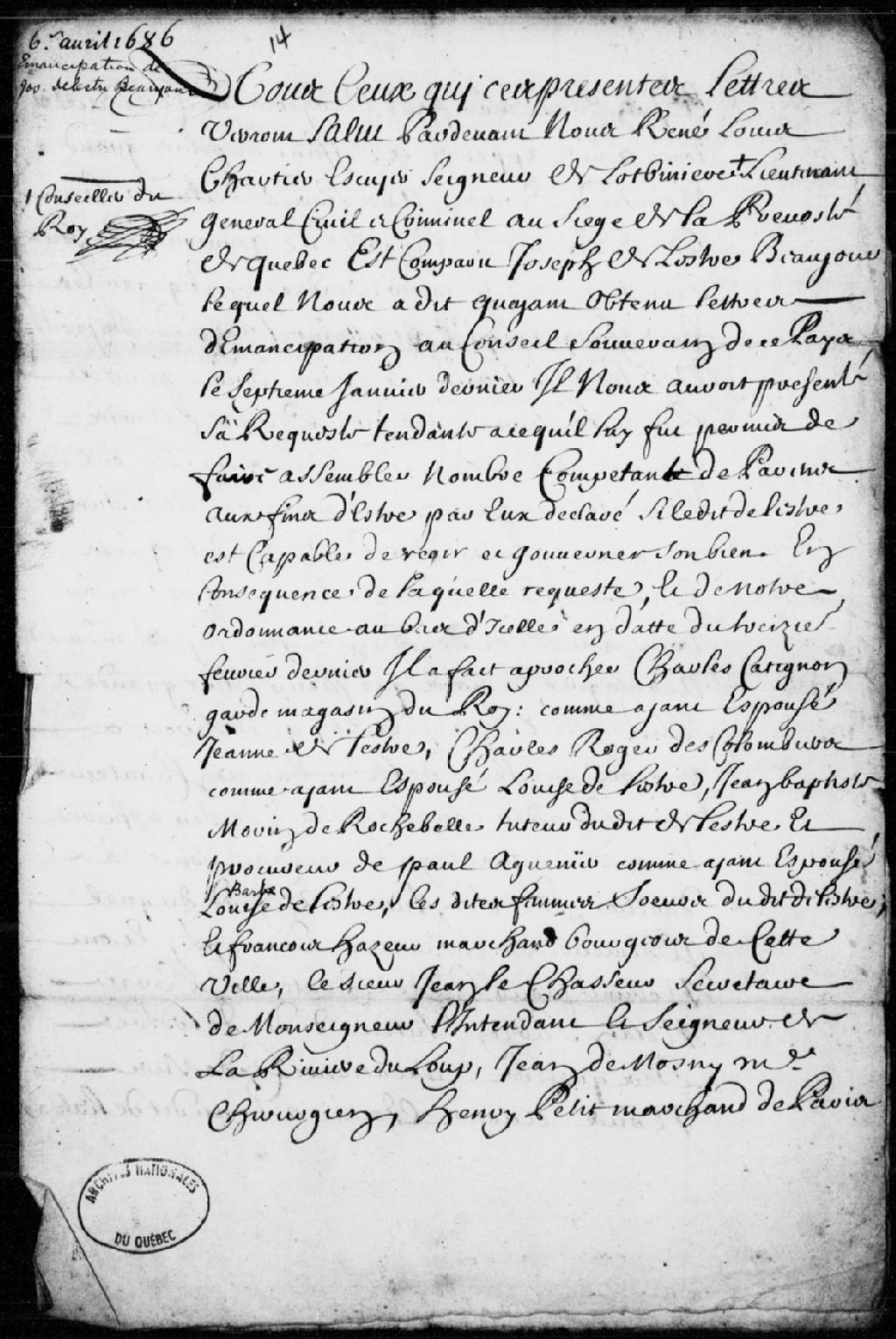 Ordonnance décrétant l'émancipation du mineur Joseph Delestre, sieur de Beaujour, qui garde cependant comme subrogé tuteur Pierre Nolan, marchand, et consentement à ce que ledit Delestre puisse disposer et jouir de ses biens et les administrer, 6 avril 1686, Archives nationales à Québec, Fonds Prévôté de Québec, (03Q,TL1,S11,SS2,D14).