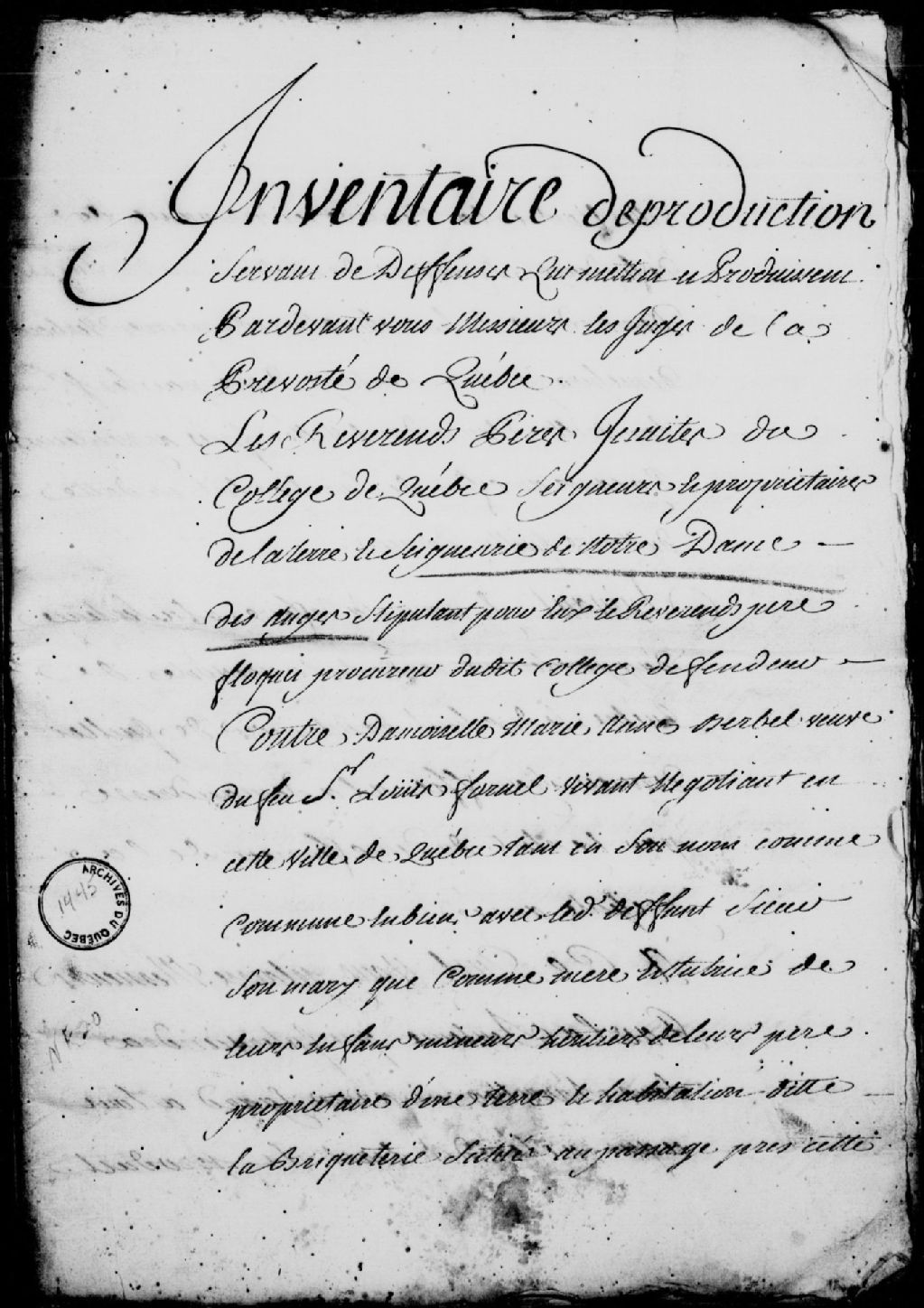 - Ce dossier comprend un inventaire de production servant de défenses produit par les Révérends Pères Jésuites du Collège de Québec contre Marie-Anne Barbel, veuve de Louis Fornel; des exploits de signification et d'assignation; une sentence rendue au Conseil supérieur de Québec mettant l'appellation à néant et condamnant ladite Barbel à payer la totalité des lods et ventes de la terre en question, ainsi que 127 livres, 10 sols et 5 deniers pour sept années, quatre mois et quinze jours d'arrérages de rentes seigneuriales, et 13 livres et 10 sols pour les dépens; un plan figuratif de la seigneurie de Notre-Dame-des-Anges, plus spécifiquement du domaine des Jésuites et de la terre de feu Louis Fournel; une sentence rendue en la Prévôté de Québec dans le procès des Dames Religieuses de l'Hôtel-Dieu de Québec, créancières de Jean Lachevêque et opposantes à la délivrance des deniers provenant de l'adjudication d'une terre saisie sur leur requête audit Larchevêque, et autres créanciers de la succession dudit défunt Larchevêque, s'opposant à la sentence d'adjudication par décret d'une terre au sieur Fornel, contre les Révérends Pères Jésuites; un procès-verbal d'arpentage de la terre en question par Charles Vallet (Vallée), arpenteur royal, suivant la requête des habitants du Gros-Pin; un procès-verbal d'arpentage de la terre en question par François Lemaître de LaMorille, arpenteur; un écrit de défenses fournit par les Révérends Pères Jésuites contre Marie-Anne Barbel; une sentence rendue en la Prévôté de Québec accordant un délai pour fournir des réponses à l'écrit de défenses fournit par les Jésuites; les réponses fournies par Marie-Anne Barbel; une sentence rendue en la Prévôté de Québec ordonnant que le procès-verbal d'arpentage produit par François Lemaître de LaMorille sera exécuté selon sa forme et teneur; un mémoire instructif produit par la veuve Fornel; une sentence accordant un délai aux Jésuites pour répondre au mémoire instructif fourni par Marie-Anne Barbel; un écrit de défenses fourni par lesdits Jésuites; une sentence ordonnant que le plan figuratif de ladite terre sera représenté, paraphé puis communiqué aux Jésuites; les observations succinctes fournies par les Jésuites; des ordonnances appointant les parties à produire; un inventaire de production des Pères Jésuites; des réponses fournies par Marie-Anne Barbel; une sentence rendue dans la cause entre Marie-Anne Barbel, les Pères Jésuites, et les Religieuses de l'Hôtel-Dieu de Québec, ordonnant qu'il soit procédé à l'arpentage de la terre en question; des requêtes présentées à la Prévôté de Québec par les Pères Jésuites; une sentence ordonnant que le sieur Plamondon, arpenteur nommé d'office, procède au bornage et à l'arpentage de la terre en question; un défaut donné à l'encontre de Marie-Anne Barbel; une requête présentée par les Pères Jésuites devant le Conseil supérieur de Québec, anticipant sur l'appel de ladite Barbel; un inventaire des pièces produites par les Pères Jésuites; une sentence nommant, au lieu du sieur de Lacorne, maître Joseph Nouchet pour faire le rapport de l'instance; un inventaire des pièces produites par Marie-Anne Barbel au Conseil supérieur de Québec; un arrêt du Conseil supérieur de Québec mettant l'appel à néant; un acte de nomination d'arbitres dans la cause opposant ladite Barbel aux Jésuites et aux Dames de l'Hôtel-Dieu de Québec, soit les sieurs Vallée, Lemaître de LaMorille et Plamondon, afin qu'ils dressent un plan figuratif de la terre de ladite veuve Fornel; un procès-verbal de bornage et d'arpentage des arpenteurs nommés; une sentence rendue en la Prévôté de Québec ordonnant que les pièces des parties demeurent sur le bureau pour qu'on délibère à leur sujet; une déclaration de l'huissier Thibault aux Révérends Pères Jésuites pour leur signifier l'appel présenté au Conseil supérieur de Québec par Marie-Anne Barbel; une requête présentée à l'intendant Bigot par les Pères Jésuites, pour être reçus anticipants par le Conseil supérieur de Québec dans l'appel interjeté par ladite Barbel, contre une sentence rendue le 14 juillet 1752; une ordonnance recevant les Pères Jésuites anticipants du susdit appel; une déclaration de l'huissier Charles Breton à Marie-Anne Barbel que les Pères Jésuites ne peuvent accepter les offres qui leur sont faites et ont été reçus anticipants de l'appel présenté au Conseil supérieur de Québec; une déclaration du sieur Thibault, huissier, informant ladite Barbel que les Pères Jésuites se pourvoiront à son encontre par voies de droit et feront saisir les fruits de la terre en question; une quittance faite à Marie-Anne Barbel pour le premier paiement dû selon un arrêt du Conseil supérieur de Québec