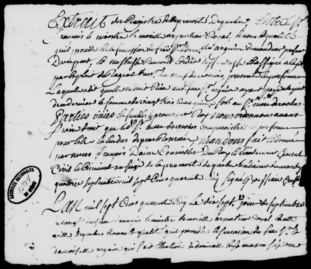 - Ce dossier comprend un défaut accordé à François Lemaître dit Lamorille, au nom et comme curateur de la succession des défunts Arguin, contre Marguerite Duchesne, femme du sieur Petitpas, assignée le 10 septembre, défaillante et condamnée aux dépens dudit défaut; un exploit de signification du défaut à la susdite Duchesne et une assignation; une sentence rendue dans le procès entre François Lemaître dit Lamorille et madame Raymond Cordier ordonnant l'assignation de Marc Desroches, pour confirmer la déclaration de ladite dame Cordier à l'effet qu'elle lui aurait payé la somme due à la succession Arguin; un exploit d'assignation dudit Marc Desroches