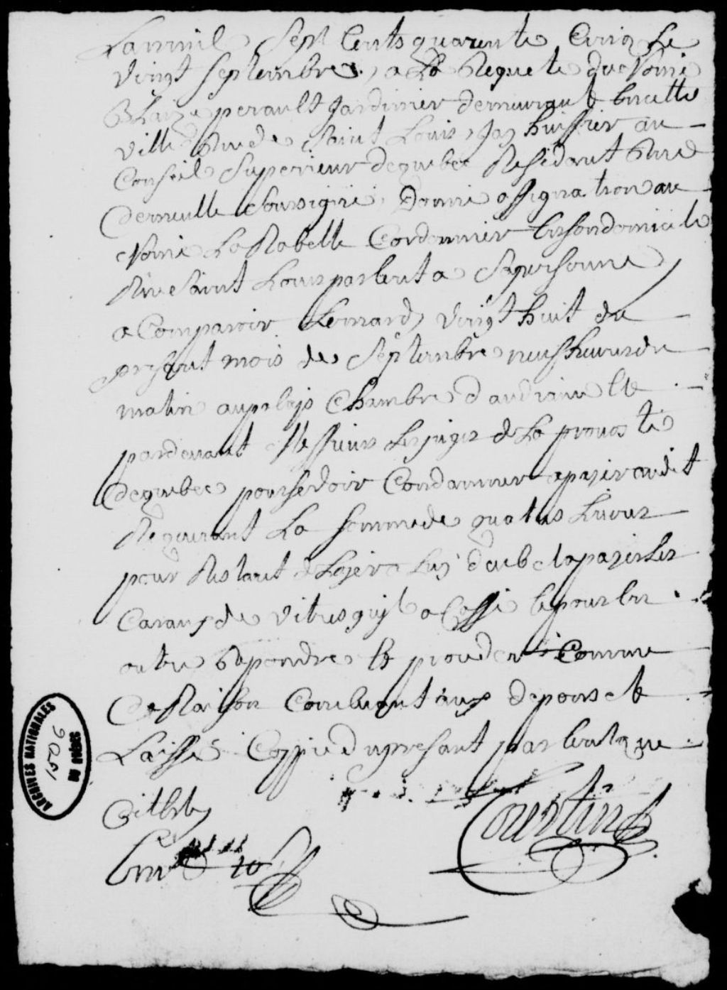 À la requête de Blaise Perrault, jardinier, demeurant sur la rue Saint-Louis, assignation du nommé Larabelle, cordonnier, domicilié au même lieu, afin qu'il paie au requérant les quatre livres qu'il lui reste à payer pour un loyer et pour la pose de carreaux de vitre, 20 septembre 1745, Archives nationales à Québec, Fonds Prévôté de Québec, (03Q,TL1,S11,SS2,D1506).