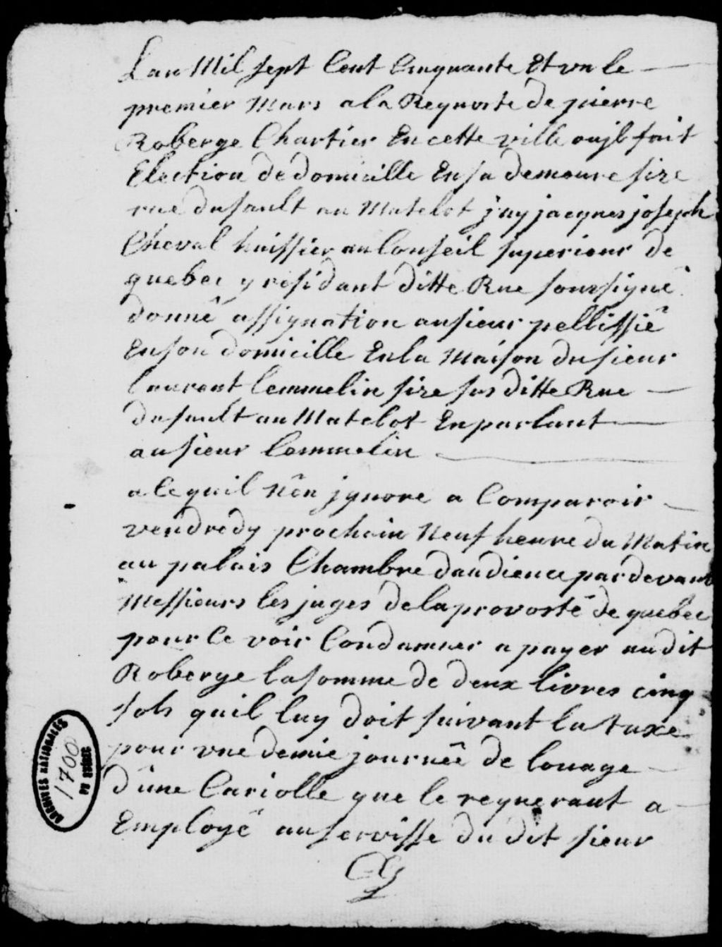À la requête de Pierre Roberge, charretier de Québec, demeurant rue du Sault-au-Matelot, assignation du sieur Pélissier, domicilié chez Laurent Lemelin, sur la même rue, afin qu'il paie au requérant la somme de 2 livres et 5 sols qu'il lui doit, suivant la taxe d'une demi-journée de location d'une carriole, avec dépens, 1er mars 1751, Archives nationales à Québec, Fonds Prévôté de Québec, (03Q,TL1,S11,SS2,D1700).