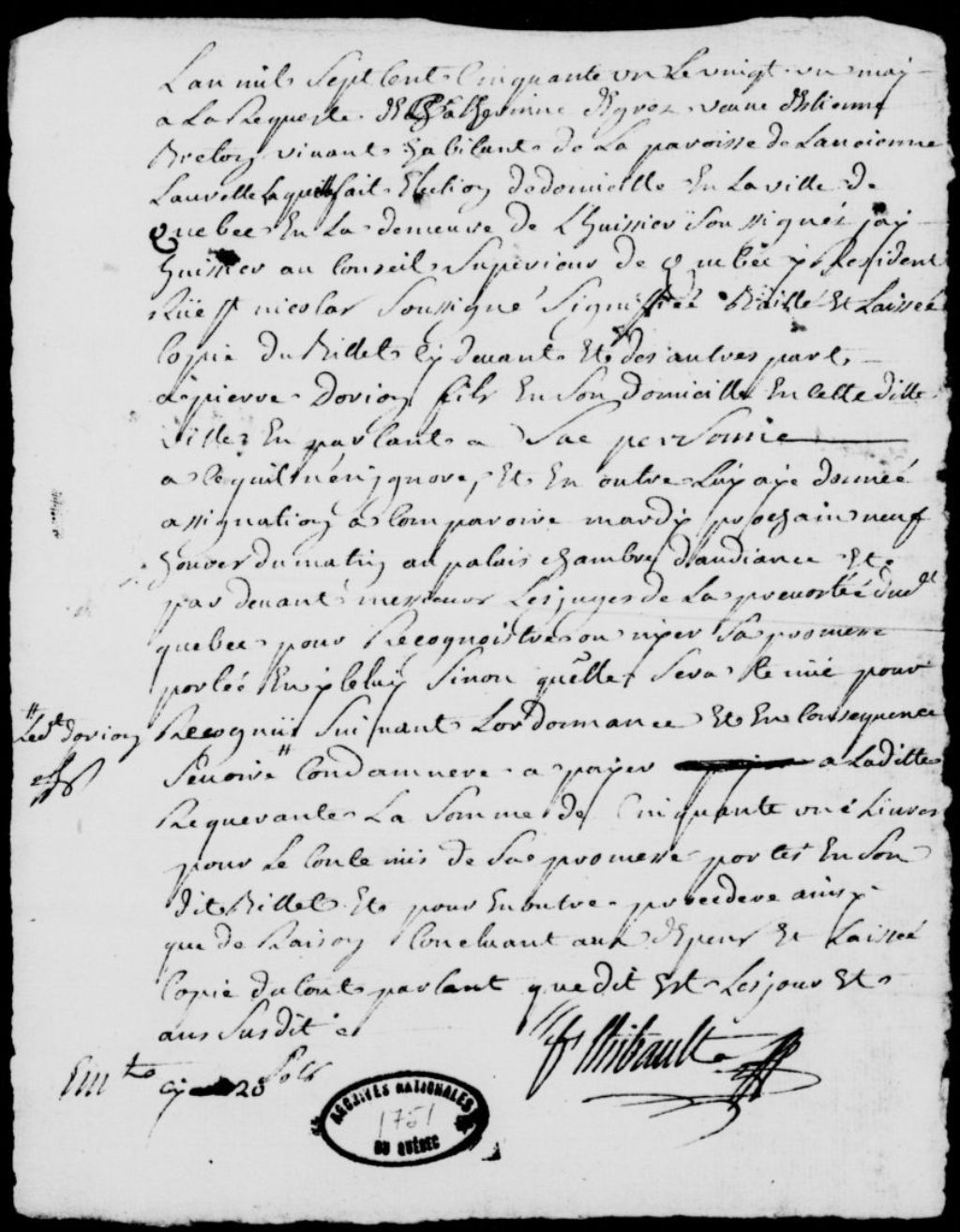 À la requête de Catherine Degres (Degré), veuve d'Étienne Breton, habitant de la paroisse de l'Ancienne-Lorette, signification d'un billet de 51 livres à Pierre Dorion, et assignation à lui donnée afin qu'il paie ladite somme à la requérante, avec dépens, 21 mai 1751, Archives nationales à Québec, Fonds Prévôté de Québec, (03Q,TL1,S11,SS2,D1751).