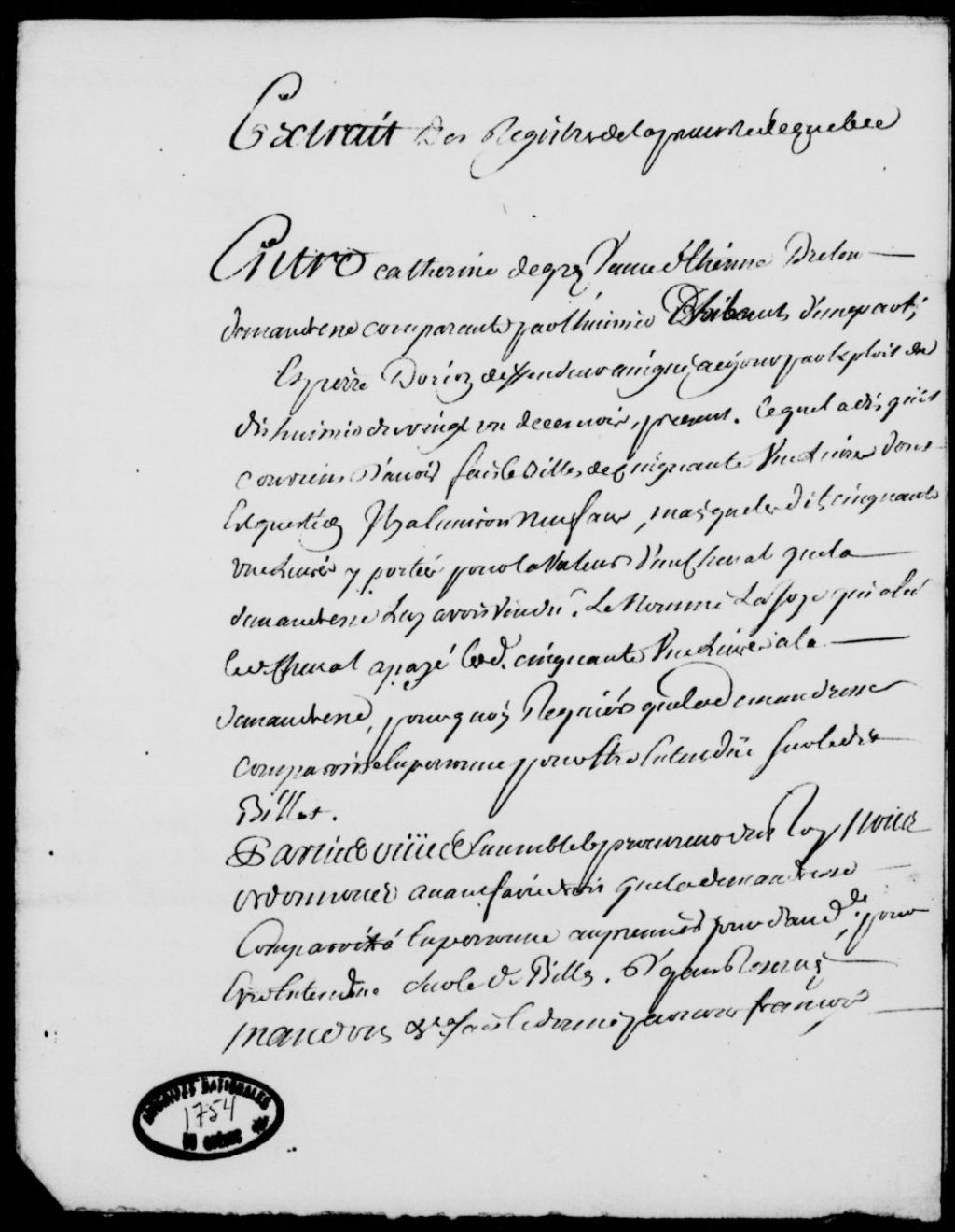 Sentence rendue dans le procès entre Catherine Degres (Degré), veuve d'Étienne Breton, habitant de la paroisse de l'Ancienne-Lorette, et Pierre Dorion fils, domicilié à Québec, le tribunal ordonnant, avant de faire droit, que la demanderesse comparaisse en personne pour être entendue au sujet du billet dont il est question, et signification de ladite sentence et assignation données au sieur Dorion, suivant la requête de ladite veuve, 25 mai 1751 - 29 mai 1751, Archives nationales à Québec, Fonds Prévôté de Québec, (03Q,TL1,S11,SS2,D1754).