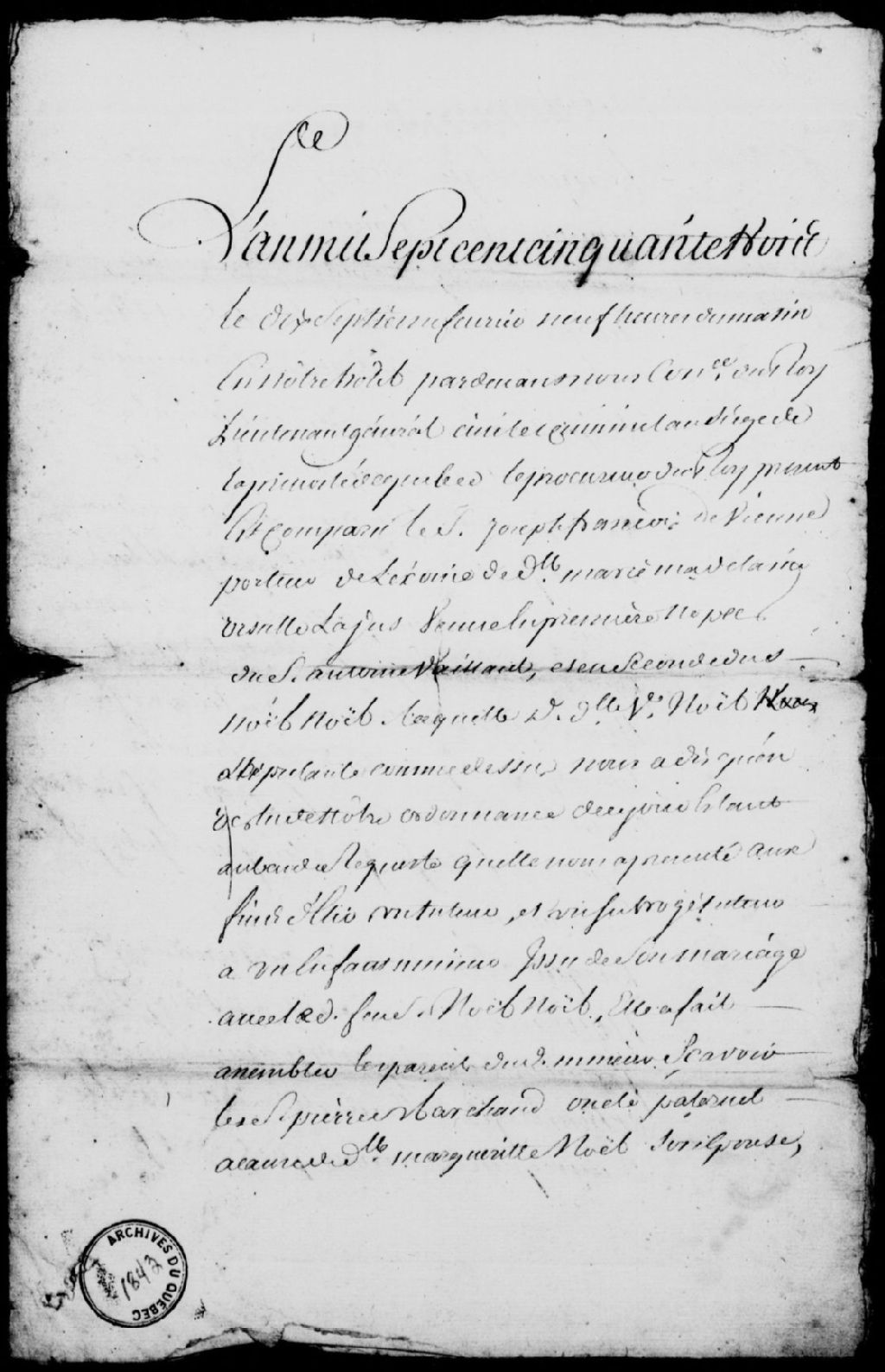 Procès-verbal pour l'élection d'un tuteur et d'un subrogé tuteur, à la requête de Marie-Madeleine-Ursule Lajus, veuve en premières noces d'Antoine Vaillant, et en secondes noces de Noël Noël, Pierre Marchand acceptant d'être tuteur du mineur Noël, et François Lajus acceptant d'être subrogé tuteur, 17 février 1753, Archives nationales à Québec, Fonds Prévôté de Québec, (03Q,TL1,S11,SS2,D1843).