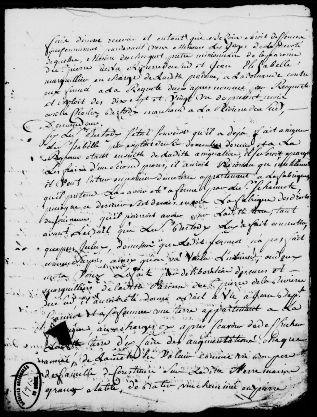 Écrit de défense que présentent messire Duchouquet, missionnaire de la paroisse de Saint-Pierre de la Rivière-du-Sud, et Jean Isabel, marguillier de ladite paroisse, contre Charles Berthody (Bertody), marchand du même lieu, par lequel lesdits défendeurs font valoir que la fabrique avait donné un bail à vie, pour une terre appartenant à ladite fabrique, à Jean-Baptiste Jeannot, sous certaines conditions, et que bien que celles-ci ne furent par remplies, ledit Jeannot passa un bail pour ladite terre avec Berthody, mais il lui fut défendu par la fabrique d'en prendre possession, et les défendeurs demandant à être renvoyés de l'action intentée contre eux, et exploit de signification dudit écrit de défense à Charles Berthody