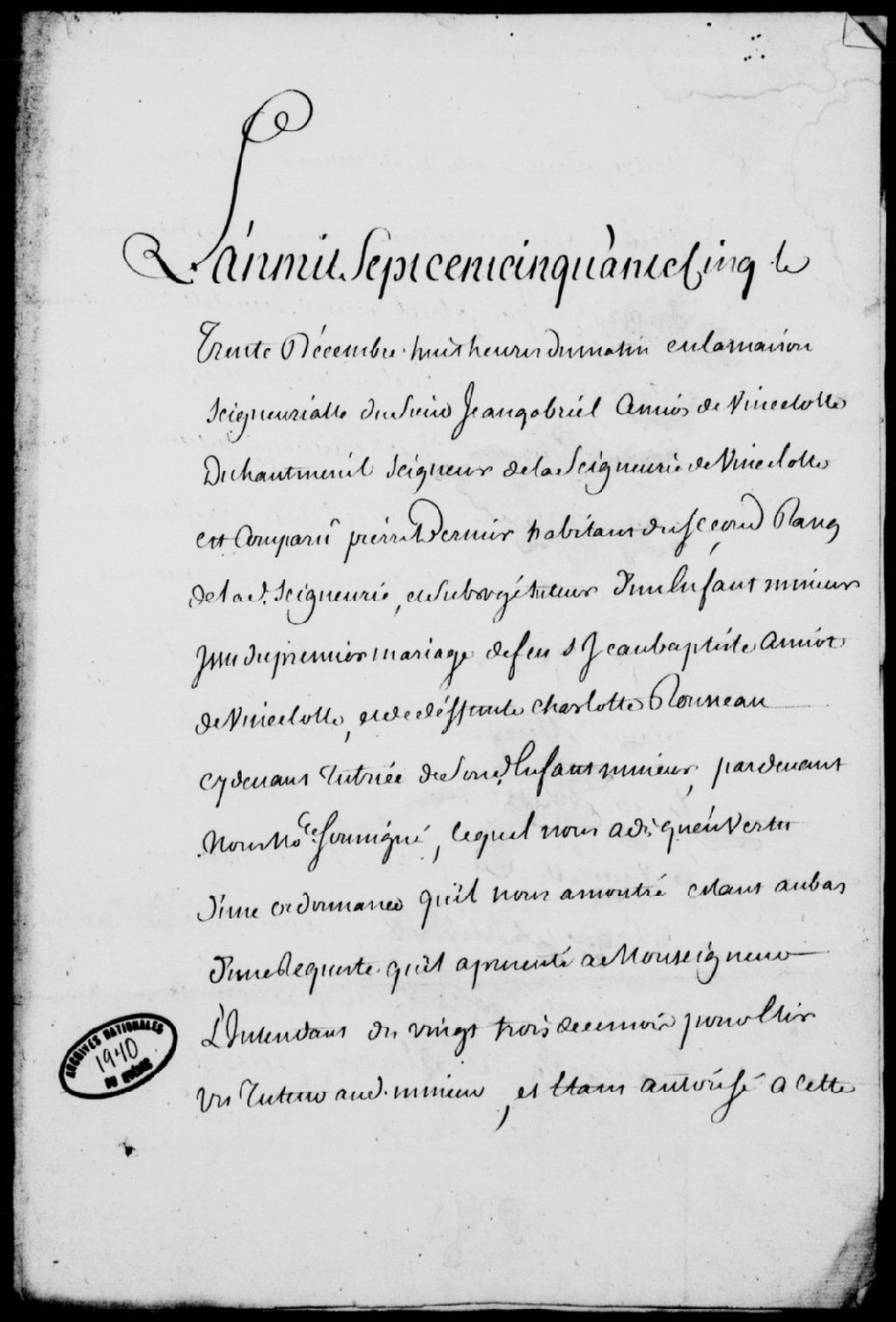 Procès-verbal de l'élection d'un tuteur pour l'enfant mineur des défunts Jean-Baptiste Amiot de Vincelotte, sieur du Hautmesnil (Hautmesny), et Charlotte Rousseau, ci-devant tutrice, à la requête de Pierre Bernier, subrogé tuteur, Jean-Gabriel Amiot de Vincelotte, sieur du Hautmesnil (Hautmesny), seigneur de la seigneurie de Vincelotte, oncle dudit mineur, étant élu tuteur