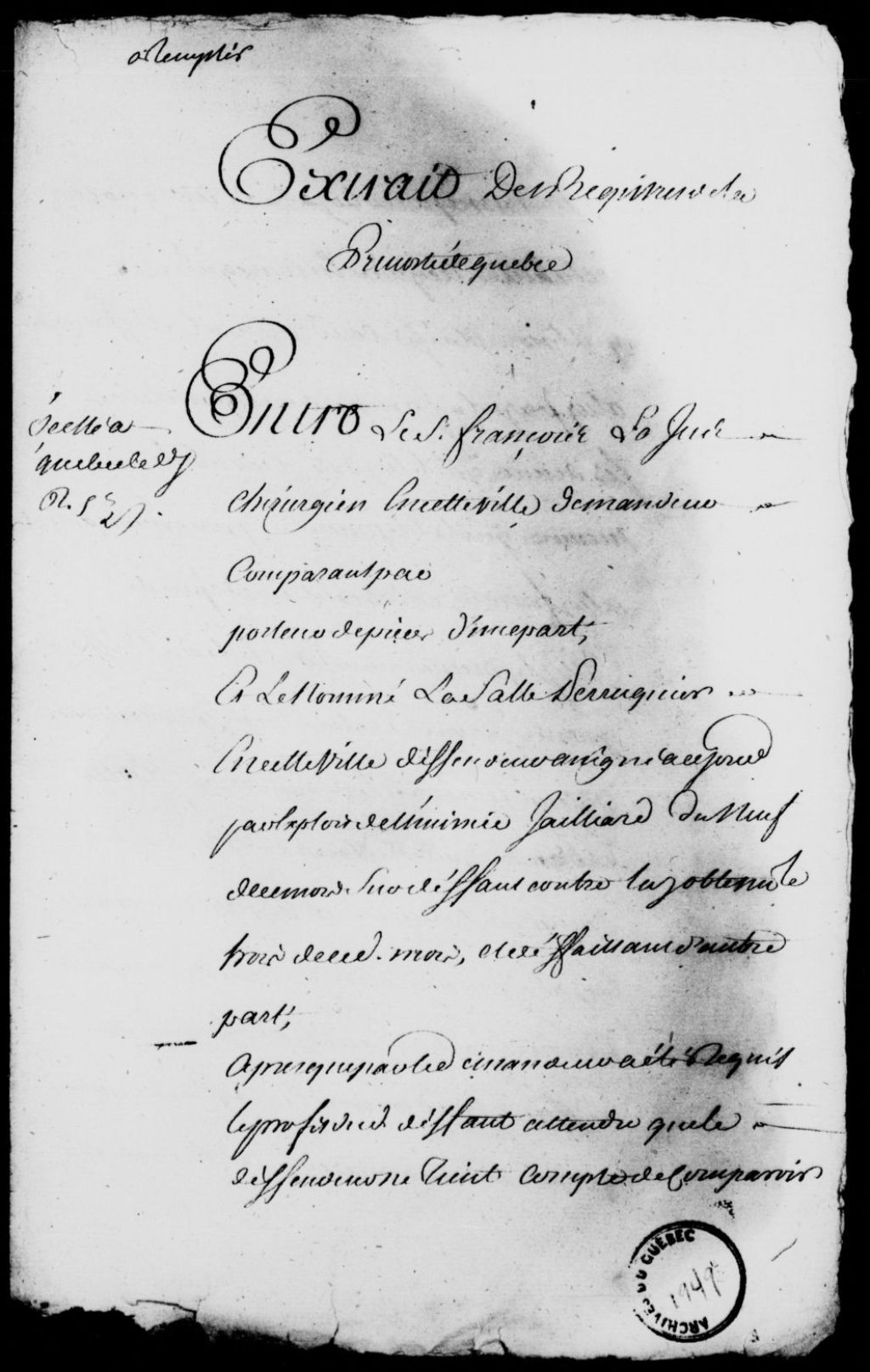 Sentence rendue dans le procès entre François Lajus, chirurgien de Québec, et le nommé Lasalle, perruquier de Québec, le demandeur exigeant le paiement d'un mémoire au montant de 21 livres et 6 deniers pour des médicaments qu'il a fournis audit Lasalle, ce qui lui est accordé, 17 février 1756, Archives nationales à Québec, Fonds Prévôté de Québec, (03Q,TL1,S11,SS2,D1949).