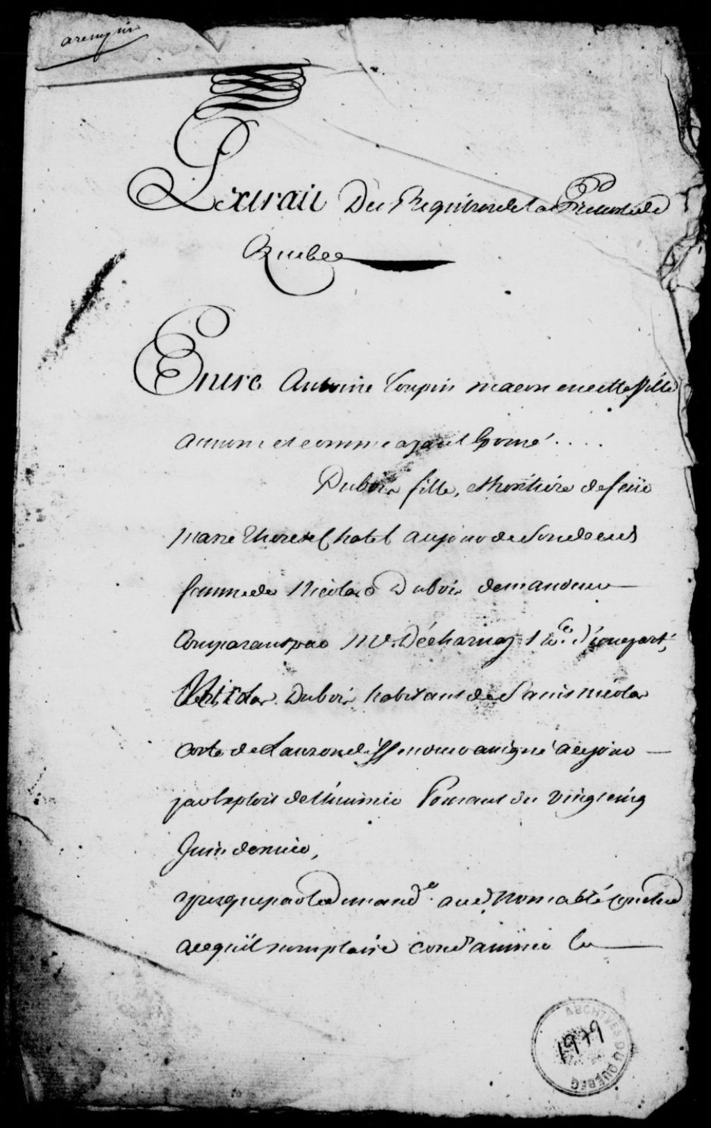 Sentence rendue dans le procès entre Antoine Toupin, maçon de Québec, au nom et comme ayant épousé mademoiselle Dubois, fille héritière de feue Thérèse Chatel, femme de feu Nicolas Dubois, comparant par maître Decharnay, et Nicolas Dubois fils, habitant de Saint-Nicolas dans la côte de Lauzon, le demandeur réclamant sa part d'héritage, tandis que le défendeur réplique qu'il n'est que le donataire, suivant un contrat de donation passé devant le notaire Choret le 12 octobre 1750, le demandeur exigeant une copie de ladite donation, et le tribunal ordonnant qu'avant de faire droit, une copie de ladite donation sera signifiée aux parties