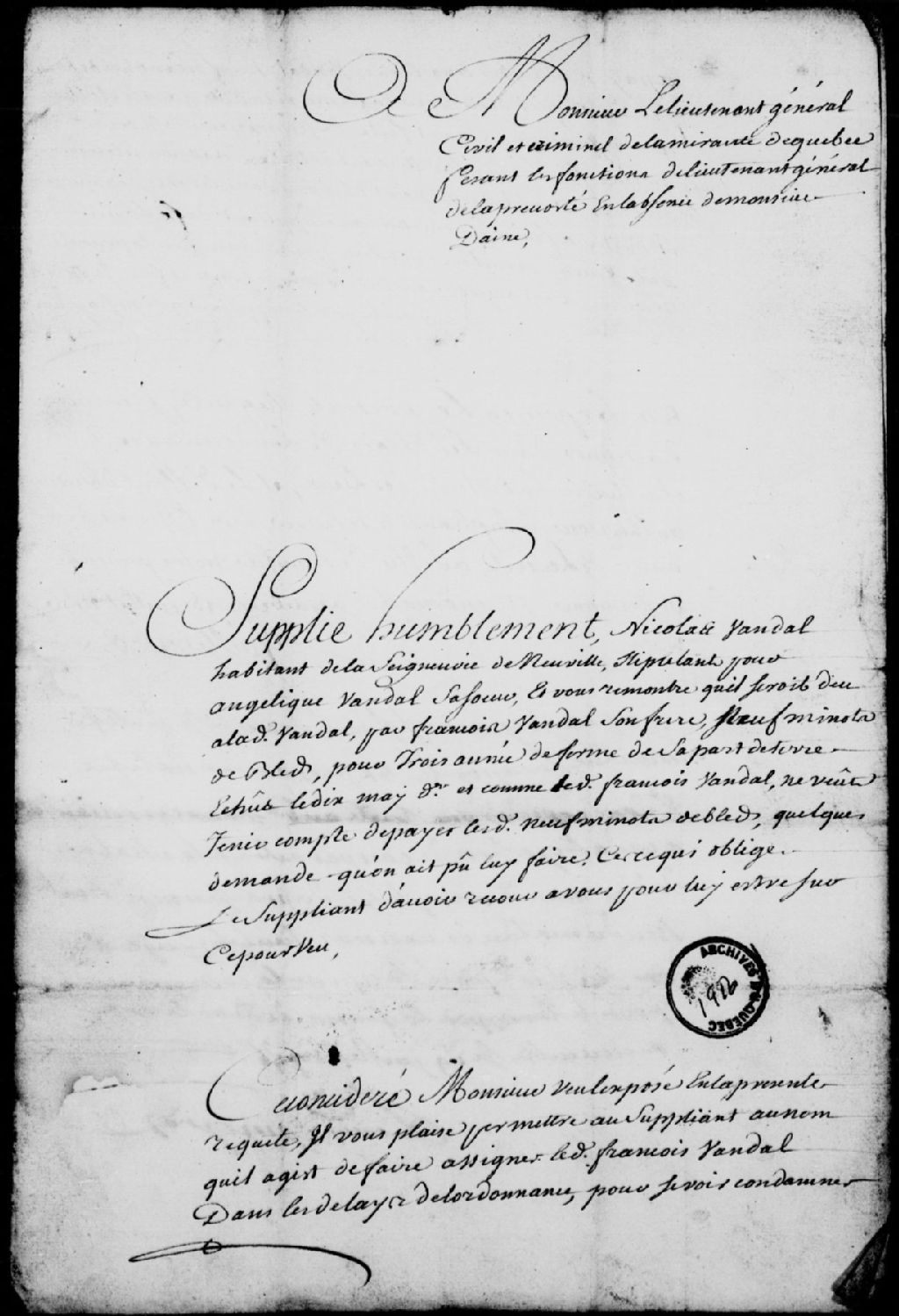 - Instance de Nicolas Vandal, habitant de la seigneurie de Neuville, stipulant pour Angélique Vandal, sa soeur, contre François Vandal, leur frère; en vertu d'un contrat daté du 1er octore 1752 et passé devant le curé de Neuville, Chartier de Lotbinière, endossé par les notaires Dulaurent et Sanguinet, les frères Vandal ont échangé leurs terres et une partie en revient à leur soeur, qui réclame ses neuf minots de blé pour trois années de ferme de sa part de terre