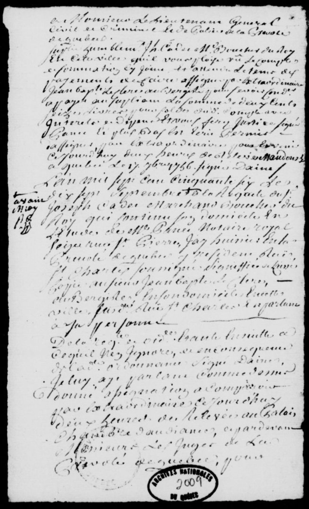 Requête de Joseph Cadet, maître boucher du Roi à Québec, pour faire assigner de façon extraordinaire Jean-Baptiste Leclerc, aubergiste, afin qu'il soit condamné à payer au requérant la somme de 216 livres pour le solde d'un compte dû, avec les intérêts et les dépens, suivie d'une ordonnance de François Daine autorisant l'assignation dudit Leclerc, et d'un exploit de signification de la requête et de l'ordonnance audit Leclerc, avec assignation, 17 septembre 1756, Archives nationales à Québec, Fonds Prévôté de Québec, (03Q,TL1,S11,SS2,D2009).