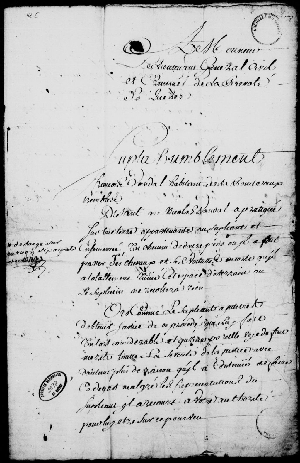 Requête de François Vandal, habitant de la Pointe-aux-Trembles, pour faire assigner Nicolas Vandal, son frère, par le lieutenant de milice Joseph Grenon, à défaut d'huissier, afin d'obtenir cinq cents livres de dédommagement, du fait que son frère a fait passer ses voitures et ses chevaux sur sa terre ensemencée, suivie d'une ordonnance autorisant l'assignation dudit Nicolas Vandal, d'un exploit de signification de la requête et du permis d'assigner ledit Nicolas Vandal, 25 juillet 1757 - 26 juillet 1757, Archives nationales à Québec, Fonds Prévôté de Québec, (03Q,TL1,S11,SS2,D2072).