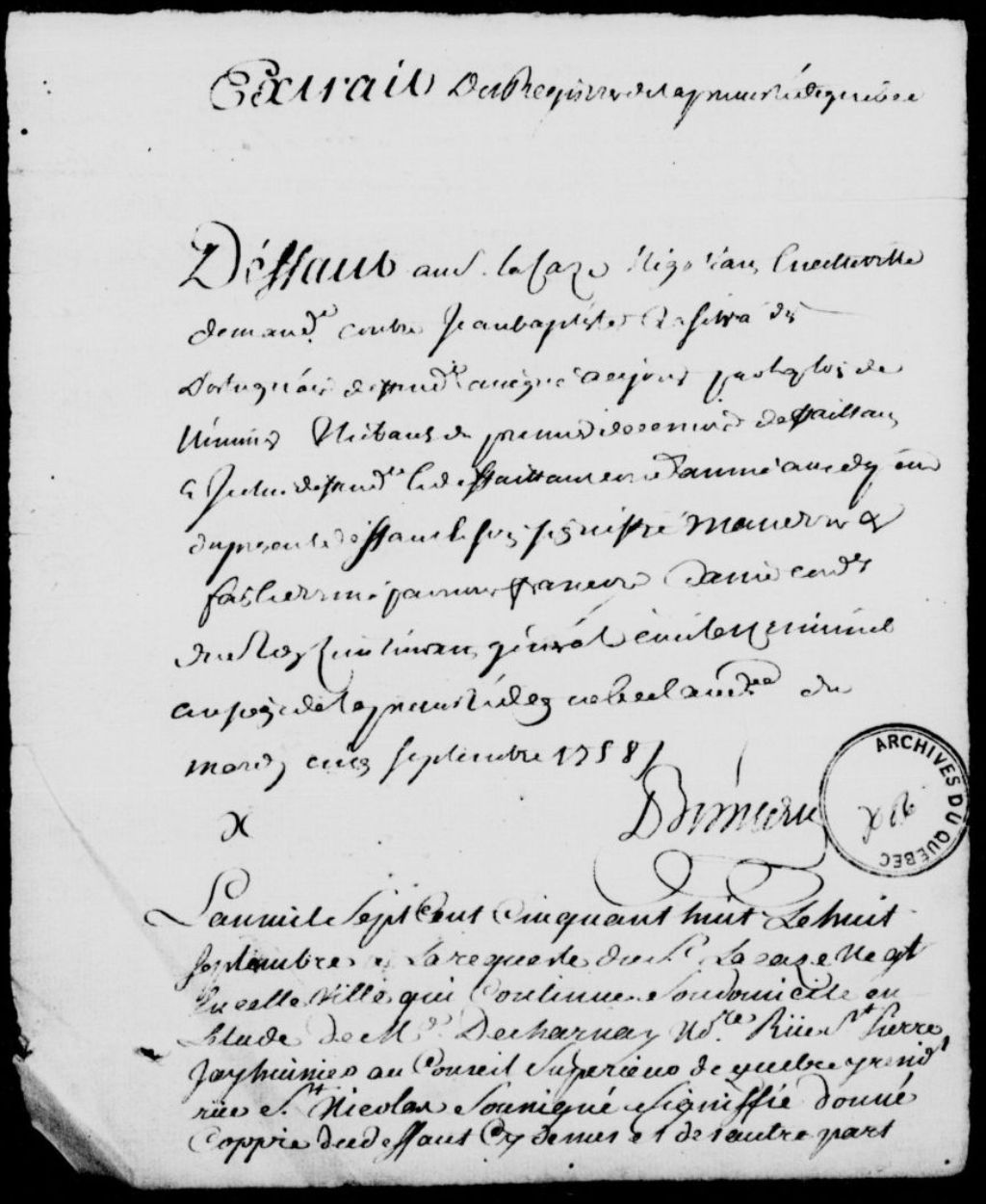 Deux pièces concernant le procès entre Jean Lacaze (Lacasse), négociant de Québec, qui a élu son domicilie en l'étude de maître Decharnay, rue Saint-Pierre, demandeur, et Jean-Baptiste Dasylva dit Portugais, domicilié rue Sainte-Famille, défendeur, au sujet du paiement d'une somme de 207 livres et 3 sols contenue dans un billet dudit Jean-Baptiste Dasylva dit Portugais à l'ordre de Jean Lacaze, en date du 14 décembre 1757