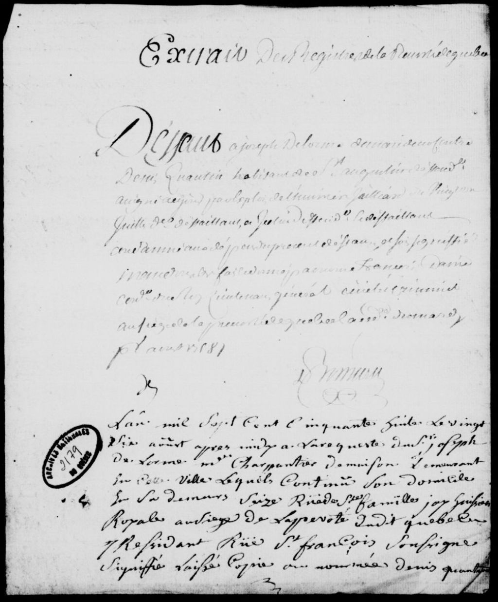 Défaut accordé par François Daine à Joseph Delorme, charpentier de Québec, contre Denis Cantin, habitant de Saint-Augustin, défendeur, assigné, défaillant et condamné aux dépens dudit défaut, signification du défaut audit Cantin, à la requête du sieur Delorme, et assignation dudit Cantin à comparaître pour voir adjuger au requérant le profit du défaut, 1er août 1758 - 26 août 1758, Archives nationales à Québec, Fonds Prévôté de Québec, (03Q,TL1,S11,SS2,D2179).