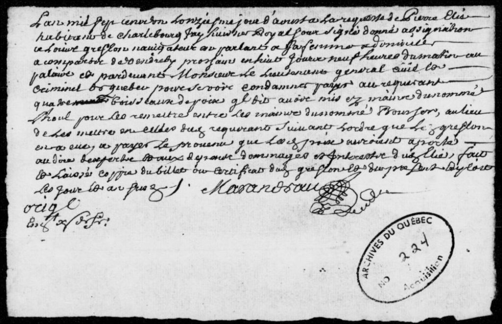 - Instance entre Pierre Élie, habitant de Charlesbourg, et Louis Greslon, navigateur et maître de barque, concernant une somme due relativement à la perte de 4 boisseaux de pois, avec dommages, intérêts et dépens