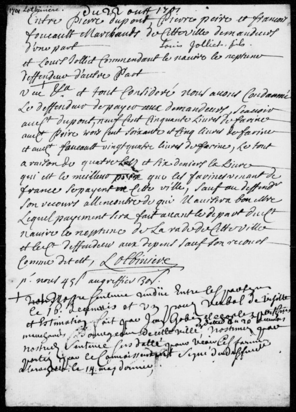 Sentence dans le procès de Pierre Dupont, Pierre Peiré et François Foucault, tous marchands de Québec, contre Louis Jolliet, commandant du navire «Le Neptune», condamnant celui-ci à livrer à chacun des demandeurs une quantité de farine déterminée par l'estimateur Jean Gobin, avant que son navire «Le Neptune» ne quitte la rade de Québec, 22 août 1701, Archives nationales à Québec, Fonds Prévôté de Québec, (03Q,TL1,S11,SS2,D225).
