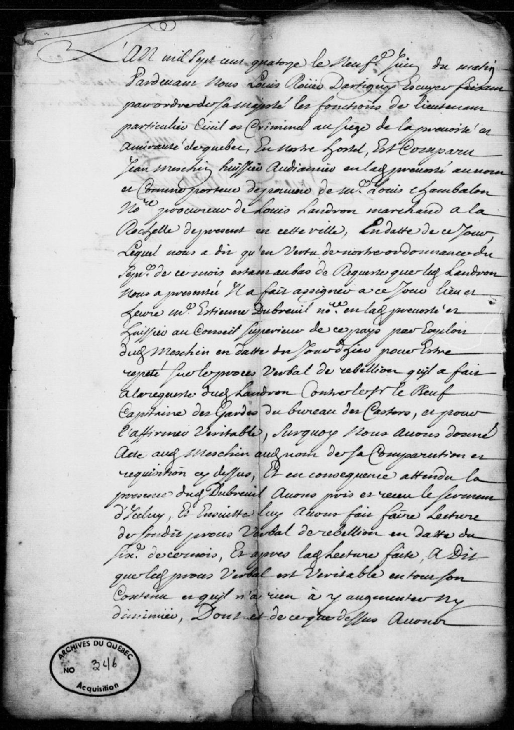 Lecture, à la demande de Louis Landron (Landeron), marchand à La Rochelle, d'un procès-verbal de rébellion rédigé par Étienne Dubreuil, notaire en la Prévôté de Québec et huissier au Conseil supérieur de Québec, contre le sieur Leboeuf, capitaine des gardes au bureau des castors, 9 juin 1714, Archives nationales à Québec, Fonds Prévôté de Québec, (03Q,TL1,S11,SS2,D346).