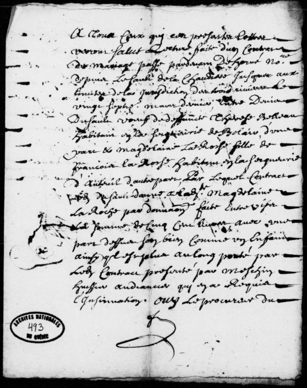 Ordonnance de Pierre André de Leigne à l'effet que le contrat de mariage passé entre Denis Dussault, veuf de feue Thérèse Pleau, habitant dans la seigneurie de Bélair, et Madeleine Laroche, fille de François Laroche, habitant de la seigneurie d'Auteuil, sera insinué et inscrit au registre, 13 juillet 1725, Archives nationales à Québec, Fonds Prévôté de Québec, (03Q,TL1,S11,SS2,D493).
