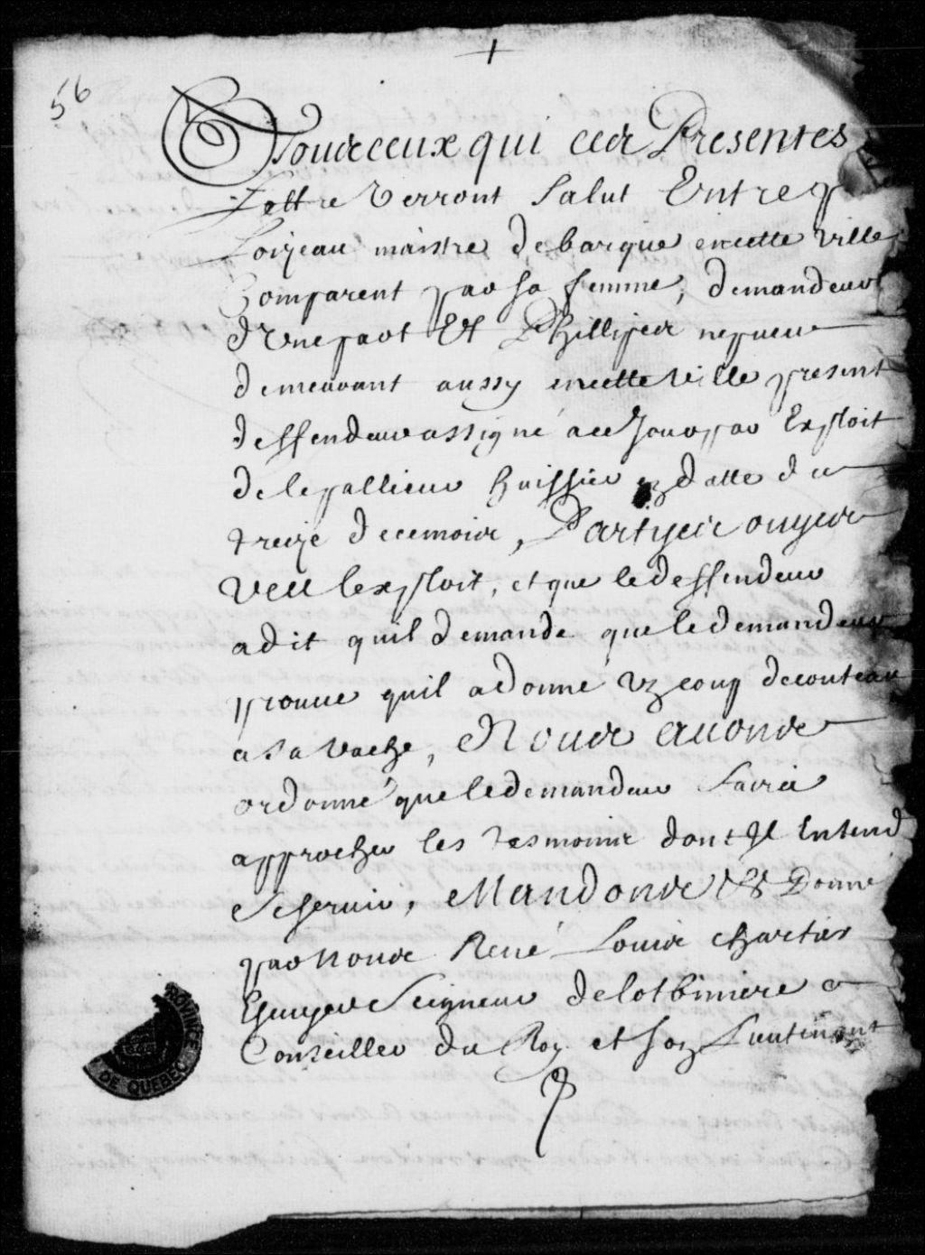 Ordonnance dans le procès de Pierre Loiseau (Lozeau), maître de barque à Québec, contre Philippe Neveu, demeurant à Québec, au sujet d'un coup de couteau donné à la vache dudit Pierre Loiseau (Lozeau); le demandeur produira comme témoins Étienne Marandeau (Maranda) et Jean Amiot; assignation auxdits témoins et à Philippe Loiseau (Lozeau), 22 juillet 1695 - 23 juillet 1695, Archives nationales à Québec, Fonds Prévôté de Québec, (03Q,TL1,S11,SS2,D56).