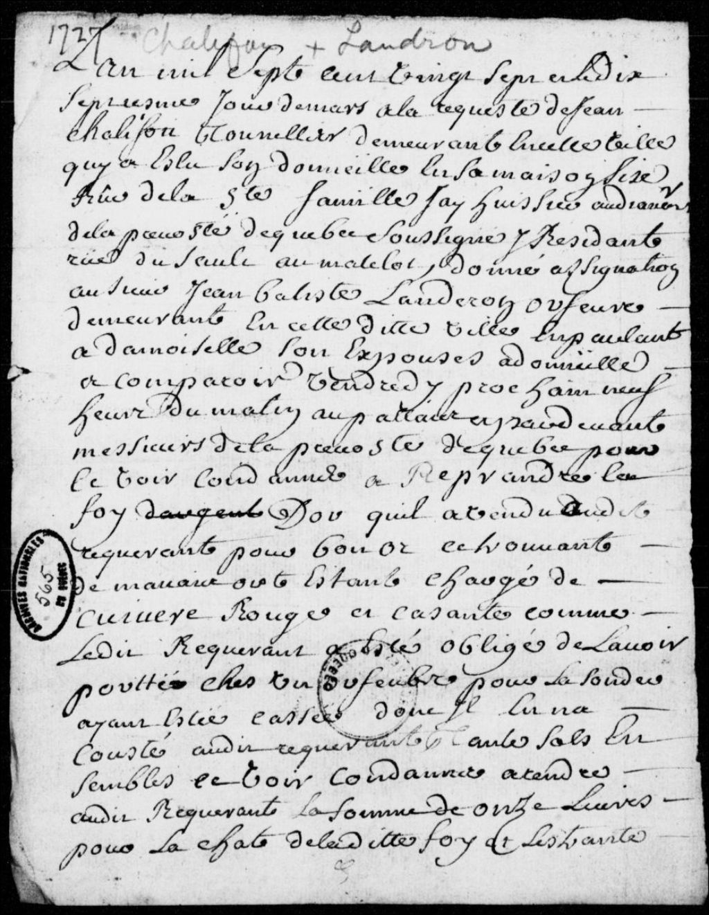 À la requête de Jean Chalifou, tonnelier à Québec, assignation de Jean-Baptiste Landron (Landeron), orfèvre demeurant à Québec, afin qu'il paie au requérant 11 livres et 30 sols pour un objet d'orfèvrerie défectueux, avec dépens, 17 mars 1727, Archives nationales à Québec, Fonds Prévôté de Québec, (03Q,TL1,S11,SS2,D565).