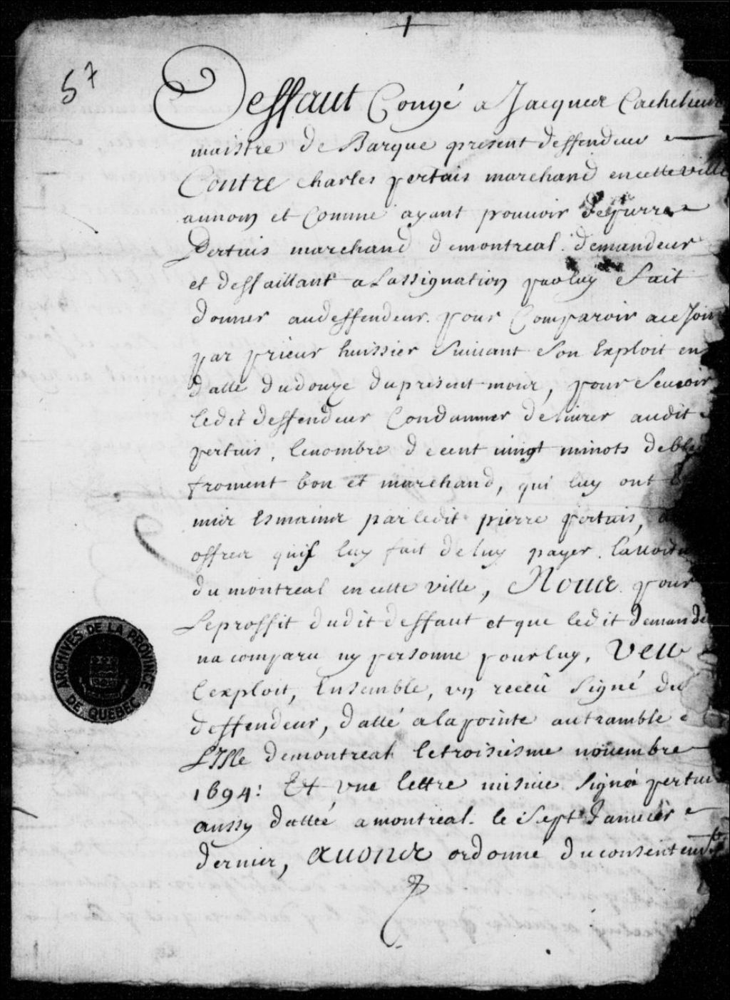 Défaut à Jacques Cachelièvre, maître de barque, contre Charles Perthuis, marchand à Québec, condamnant le défendeur à payer le port et le retardement de 120 minots de blé; deux significations à Charles Perthuis, 22 juillet 1695 - 20 août 1695, Archives nationales à Québec, Fonds Prévôté de Québec, (03Q,TL1,S11,SS2,D57).
