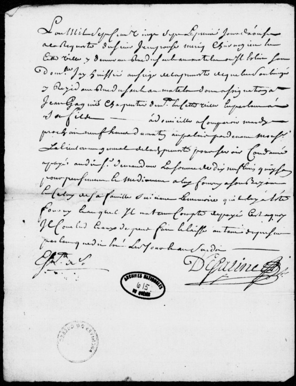 À la requête de Jean-Ponce Méric (Mériq), chirurgien à Québec, assignation de Jean Gagné, charpentier demeurant à Québec, afin qu'il paie au requérant 19 livres et 15 sols pour des pansements et des médicaments fournis à sa famille et à lui-même, avec dépens, 1er août 1727, Archives nationales à Québec, Fonds Prévôté de Québec, (03Q,TL1,S11,SS2,D615).