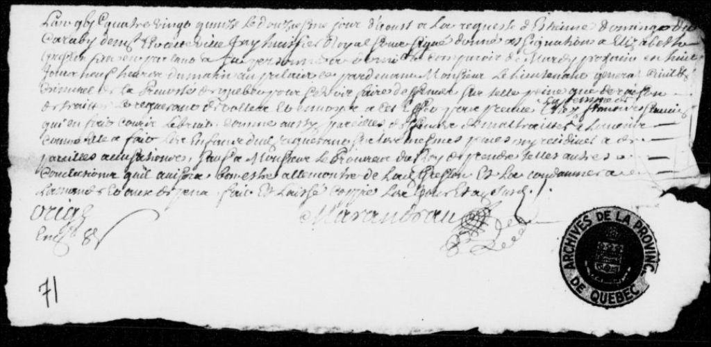À la requête d'Étienne Domingo dit Carabi, de Québec, assignation d'Élisabeth Greslon afin de l'obliger à cesser de traiter le requérant de voleur, de se servir de la femme de François Saucier pour répandre ce bruit et de maltraiter les enfants dudit requérant, 12 août 1695, Archives nationales à Québec, Fonds Prévôté de Québec, (03Q,TL1,S11,SS2,D71).