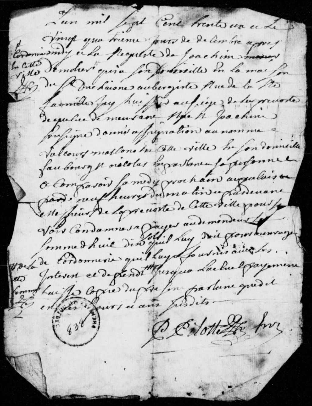 À la requête de Joachim Desmoliers (Demolier), cordonnier de Québec, assignation d'un nommé Valcourt, maçon à Québec, afin qu'il paie au requérant un montant d'argent pour des ouvrages de cordonnerie, avec les intérêts et les dépens