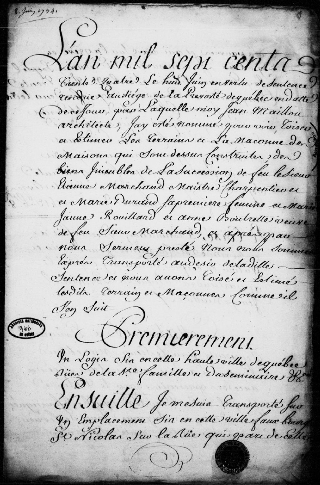 Rapport de Jean Mailloux, architecte, expert nommé d'office pour procéder à l'estimation des biens immeubles de la succession de feu Étienne Marchand, maître charpentier, de feue Marie Durand, sa première femme, de feue Jeanne Rouillard, sa seconde épouse, et d'Anne Boutret, sa dernière épouse (copie collationnée le 16 février 1736), 8 juin 1734 -16 février 1736, Archives nationales à Québec, Fonds Prévôté de Québec, (03Q,TL1,S11,SS2,D966).