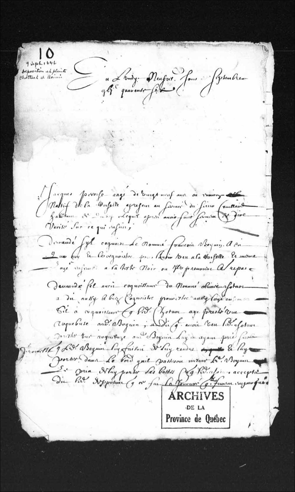 Dépositions de Jacques Perroche, 29 ans, natif de La Rochelle, serviteur de Guillaume Couillard, habitant de Québec et Philippe Paquet, natif de La Rochelle, 23 ans, au service d'Olivier Letardif (Tardif), seigneur en partie de Beaupré, dans l'affaire entre Olivier Chottard (Chotard) et François Boivin, à propos d'une arquebuse, 9 septembre 1646, Archives nationales à Québec, Collection Pièces judiciaires et notariales, (03Q,TL5,D10).