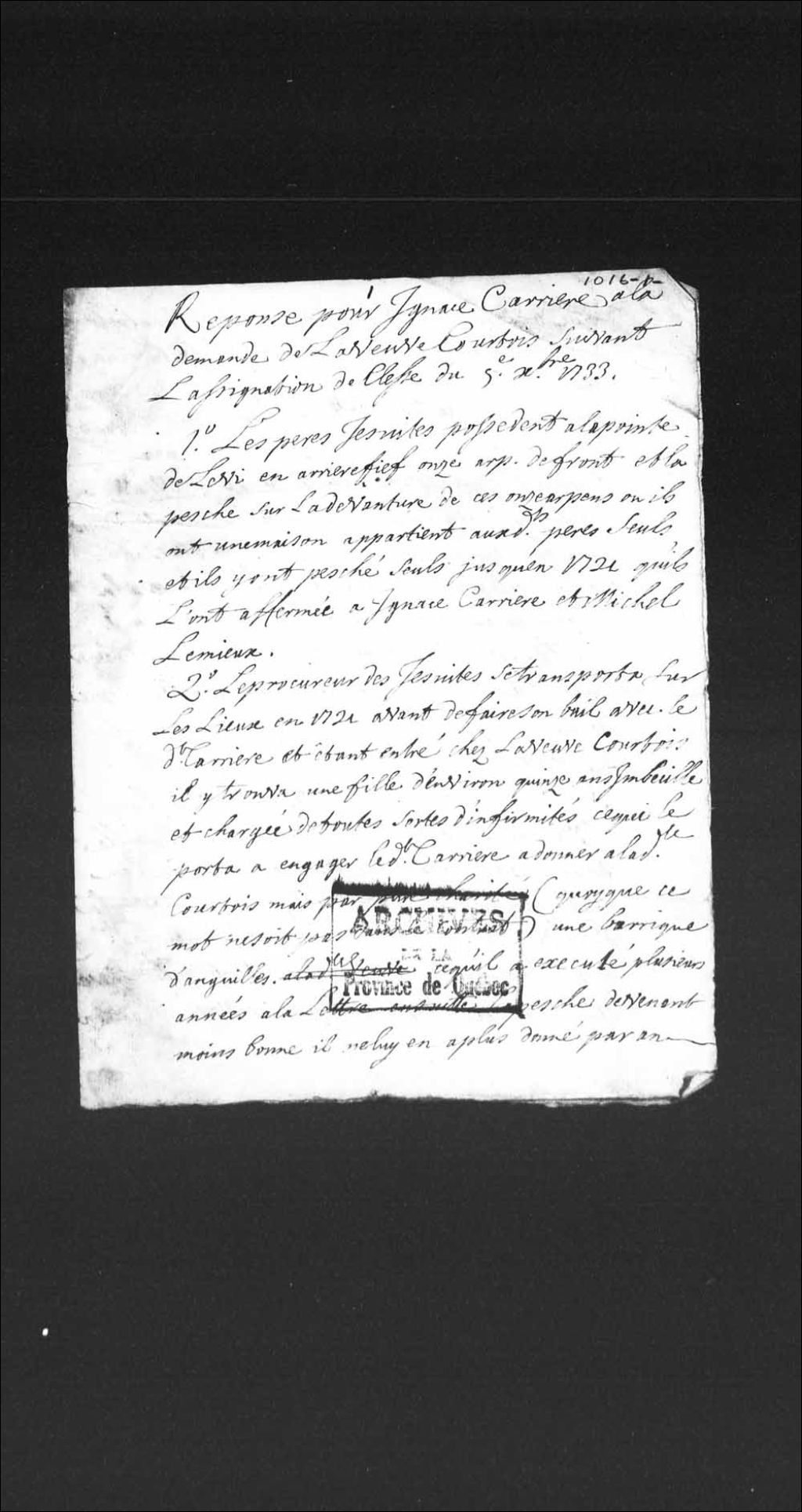 - Ce dosssier en matières civiles provient de la Prévôté de Québec et du Conseil supérieur de Québec. Ce dossier comprend les réponses produites par Ignace Carrier, suivant l'assignation à lui donnée à la requête de la veuve Courtois; des exploits de signification et d'assignation; une déclaration du procureur des Jésuites faite devant le Conseil supérieur de Québec, en faveur d'Ignace Carrier, contre la veuve Courtois; les griefs produits par Ignace Carrier devant le Conseil supérieur de Québec