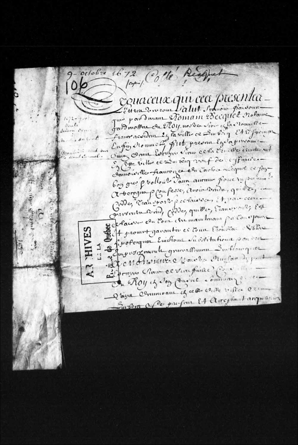 Vente de la place nommée le Montcarmel, située en la Haute-Ville de Québec avec un moulin à vent, par Simon Denis de la Trinité, de Québec, à Nicolas Dupont de Neuville, de Québec, conseiller au Conseil souverain; suivi de la quittance en date du 22 octobre 1672, 9 octobre 1672, Archives nationales à Québec, Collection Pièces judiciaires et notariales, (03Q,TL5,D106).