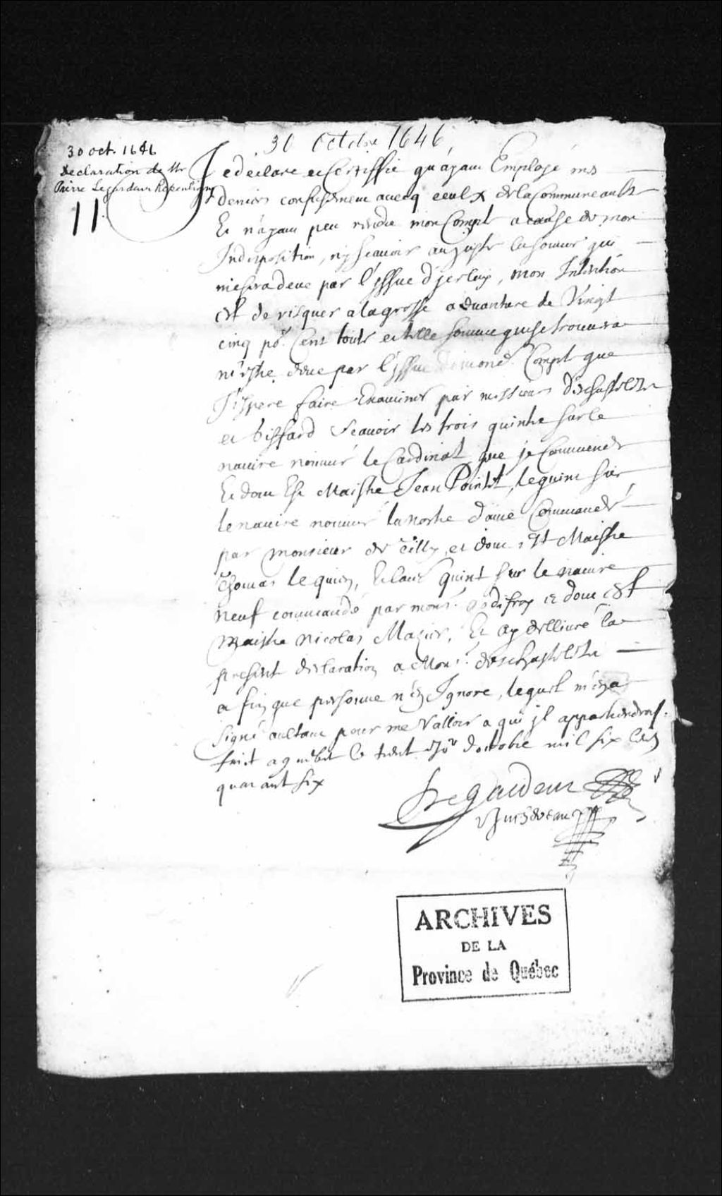 Entente de commerce «à la grosse aventure» entre Noël Juchereau des Châtelets, Robert Giffard et Pierre Legardeur de Repentigny: Legardeur de Repentigny, amiral de la flotte de la Communauté, déclare qu'il a utilisé «confusément» ses deniers et ceux de la communauté et qu'il n'a pu faire ses comptes, que messieurs des Châtelets et Giffard iront examiner les le navire «Le Cardinal» dont le commandant est Repentigny et le maître Jean Pointel, le «Notre-Dame», commandé par monsieur (Charles Legardeur) de Tilly et dont le maître est Thomas Lequien, «le Navire neuf» commandé par monsieur (Jean-Paul) Godefroy et qui a pour maître, Nicolas Mazier, 30 octobre 1646, Archives nationales à Québec, Collection Pièces judiciaires et notariales, (03Q,TL5,D11).