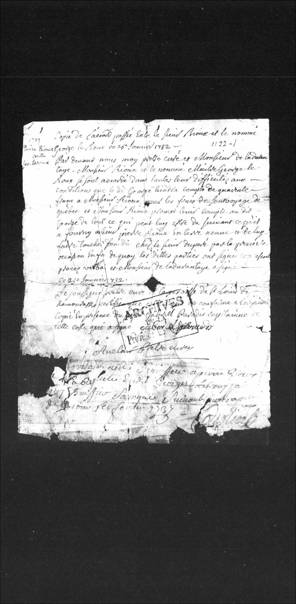 - Ce dossier en matières civiles provient de l'Amirauté de Québec et du Conseil supérieur de Québec. Ce dossier comprend une copie de l'accord entre le sieur Broux et Georges Leroux; un certificat attestant que Sylvain Labreuille et Claude Porichon ont été engagés comme matelots; une lettre de Nicolas Rioux où il s'engage à fournir son bâtiment; un état du pain qu'il y a dans le bâtiment; un certificat où le capitaine du «Saint-Pierre» déclare avoir trouvé le bâtiment du sieur Rioux mouillé sur une pointe de roches; un certificat signé par Labreuille et Porichon attestant que le sieur Rioux n'a pas mis Georges Leroux en dehors de son bâtiment; un procès-verbal de la visite du bâtiment le «Saint-François»; des requêtes; des exploits d'assignation; des comparutions; un procès-verbal de la visite du bâtiment le «Saint-Pierre»; un certificat où Joseph David atteste que Georges Leroux a mouillé sur les moutures de La Malbaie où il a failli faire périr le bâtiment et l'équipage; un certificat où François Luzeau et Martin Jourdain attestent que le sieur Rioux n'a pas empêché Georges Leroux ni son fils d'embarquer dans son bâtiment pour monter à Québec; un certificat où Jean Aubut atteste que le sieur Rioux a vendu 214 livres de biscuits au sieur François Aubut; un certificat où le dit Labreuille donne plein pouvoir au sieur Nicolas Rioux de se faire payer par Georges Leroux la somme de 50 livres que Leroux doit à Labreuille pour ses salaires; des griefs et moyens d'appel mis pardevant le Conseil supérieur de Québec par Nicolas Rioux; un état du pain et d'autres vivres qu'il y a dans le bâtiment; un certificat qui atteste que le nommé Rioux a menacé de mort Georges et Jean Leroux; des réponses; un compte rendu par Nicolas Rioux à Georges Leroux; la sentence du Conseil supérieur de Québec; un mémoire instructif contredisant les prétendus griefs et moyens d'appel; des ordonnances; une lettre où Nicolas et Pierre Rioux donnent pouvoir à Monsieur Barbel père de poursuivre l'instance qu'ils ont pardevant le Conseil supérieur de Québec contre Georges Leroux