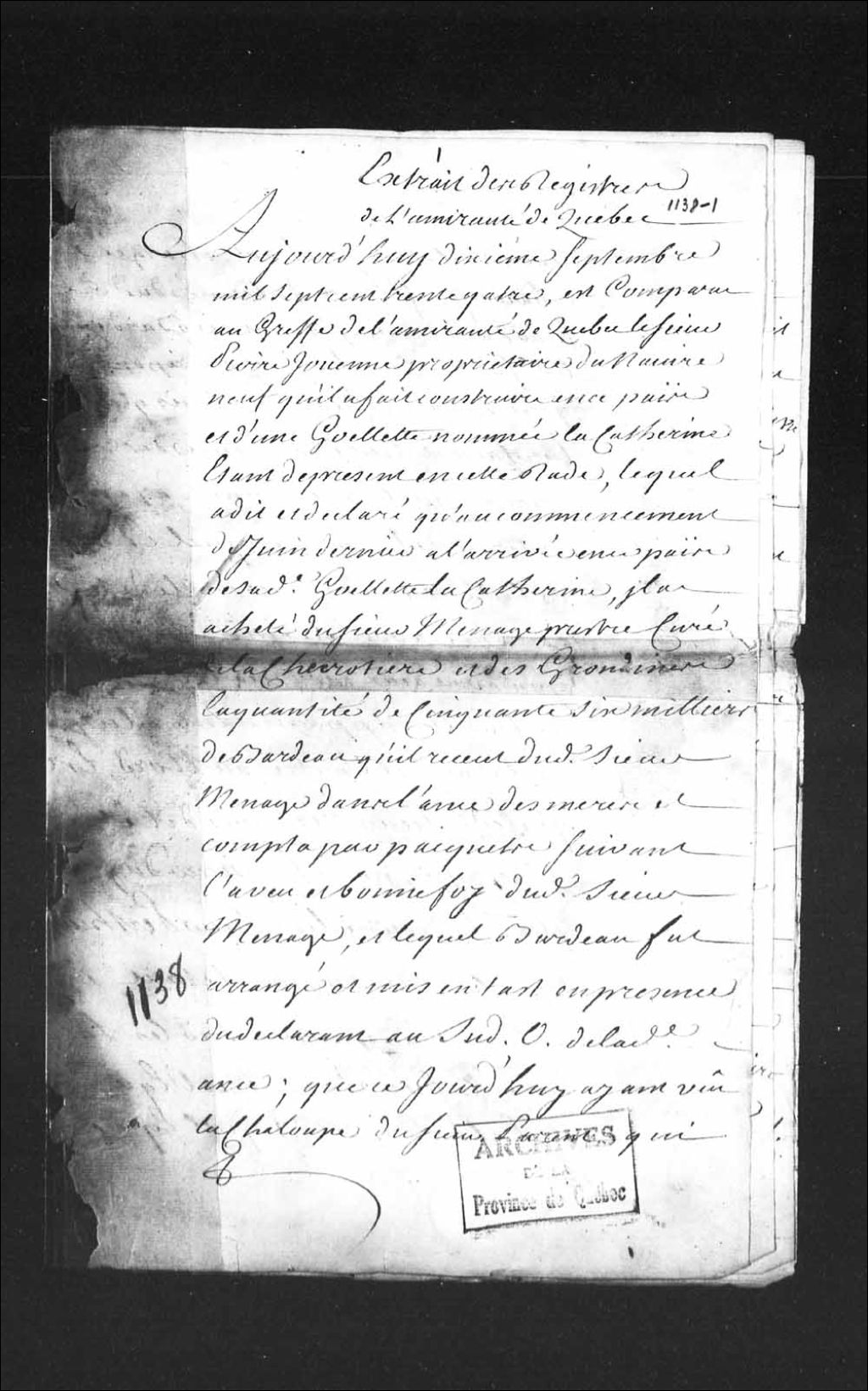 Procès de Pierre Jouanne (Joanne), capitaine et maître du navire «le Triomphant», contre Charles Perthuis, négociant à Québec, 10 septembre 1734 - 20 septembre 1734, Archives nationales à Québec, Collection Pièces judiciaires et notariales, (03Q,TL5,D1138).