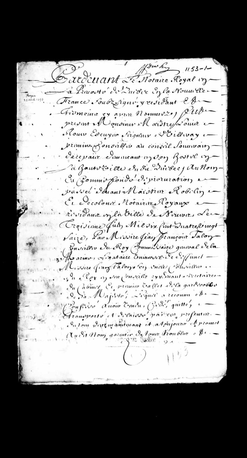 - Ce dossier en matières civiles provient de la Prévôté de Québec. Ce dossier comprend des actes pardevant le notaire royale de la Prévôté de Québec; un certificat de baptême du garçon de François Decelles et Marie-Madeleine d'Auteuil; un compte de Monsieur d'Auteuil; des exploits d'assignation; un compte entre Antoine Dionne et d'Auteuil; un billet où Charles Macarthy, capitaine du navire «la Marianne», promet de livrer des marchandises à Monsieur de la Chesnaye (LaChesnaye); une facture de la veuve Delastre pour de la marchandise qu'elle a chargé dans le navire «la Marianne» pour le compte de Monsieur d'Auteuil; un billet de d'Auteuil où il demande que le sieur Sansouci remettras au sieur Barbel, chargé de ses affaires, la somme de 144 livres pour être remis à son cousin; un inventaire des titres et papiers de feu François-Madeleine Ruette d'Auteuil; un billet où la veuve Landron atteste devoir à François Perreault, marchand de Québec, la somme de 200 livres et 4 sols; un billet de d'Auteuil où il affirme que le fermier Laroche livreras 22 minots entiers de blé, qui reviennent à la succession de son père, au sieur Barbel; un billet où François Mercure promet de payer à Monsieur d'Auteuil la somme de 180 livres; un billet de François Perreault où il confirme avoir reçu de Monsieur Barbel la somme de 33 livres et 15 sols; un état de ce qu'André Dubuc, fermier antérieur de Monsieur d'Auteuil, a mis entre les mains de Jean Laroche; une lettre de Dumont, curé de Neuville, concernant deux états des fermiers du sieur d'Auteuil suite à son décès