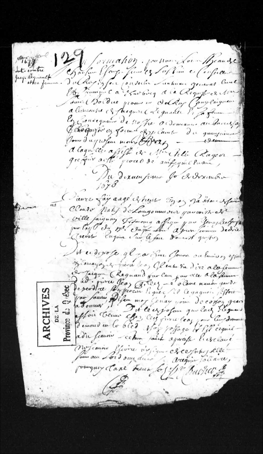 - Ce dossier en matières criminelles provient de la Prévôté de Québec et contient les interrogatoires ou les dépositions des personnes suivantes : Pierre Fay, 31 ans, habitant de Saint-Claude, natif de l Angoumois, paroisse de Ville faignan (Villefagnan); Pierre Jean, habitant de Charlesbourg, 28 ans, natif de La Rochelle, paroisse Saint-Nicolas; Françoise Cousin, femme de Charles Gaudreau (Gotreau), habitant de Charlesbourg, 40 ans; Charles Marquis, 20 ans, natif de Mortaigne de Poitou, depuis peu demeurant en cette ville, marchand de vin et maître tailleur, de Québec. Ce dossier comprend l'information et les interrogatoires fait par Louis Théandre Chartier de Lotbinière, conseiller au Conseil souverain et lieutenant général civil et criminel de la Prévôté de Québec